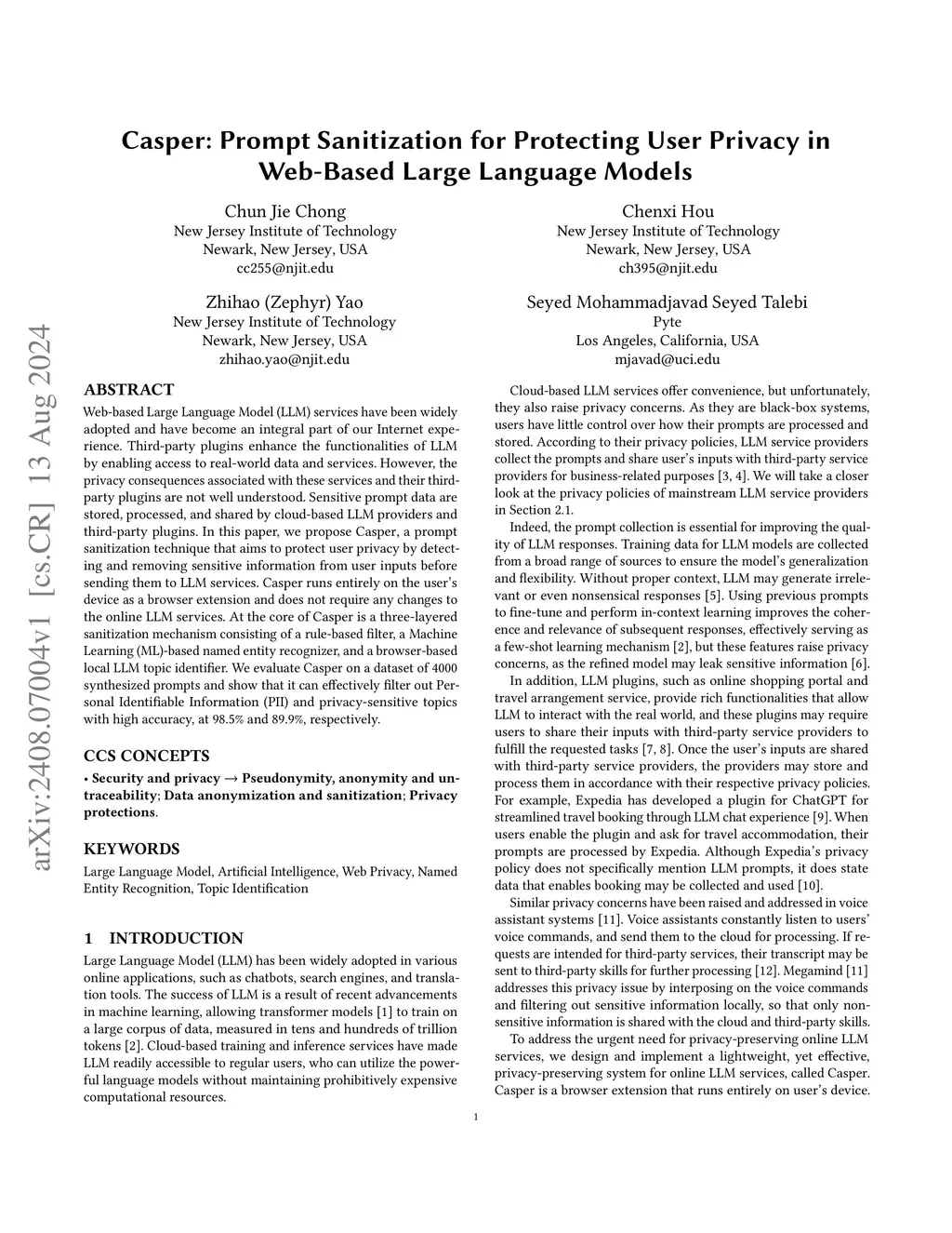 Casper: Prompt Sanitization for Protecting User Privacy in Web-Based