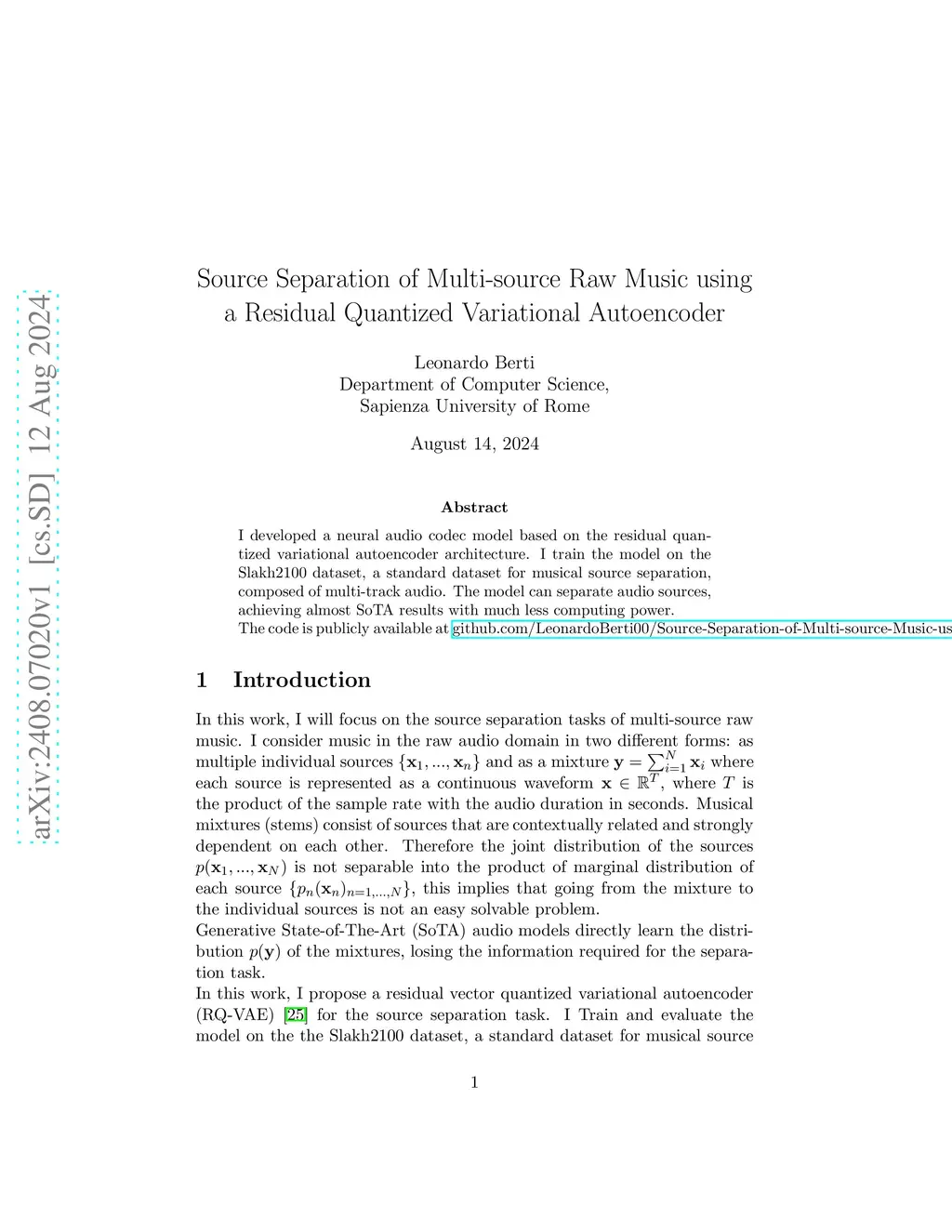 I developed a neural audio codec model based on the residual quantized variational autoencoder architecture. I train the model on the Slakh2100 dataset, a standard dataset for musical source separation, composed of multi-track audio. The model can separate audio sources, achieving almost SoTA results with much less computing power. The code is publicly available at github.com/LeonardoBerti00/Source-Separation-of-Multi-source-Music-using-Residual-Quantizad-Variational-Autoencoder