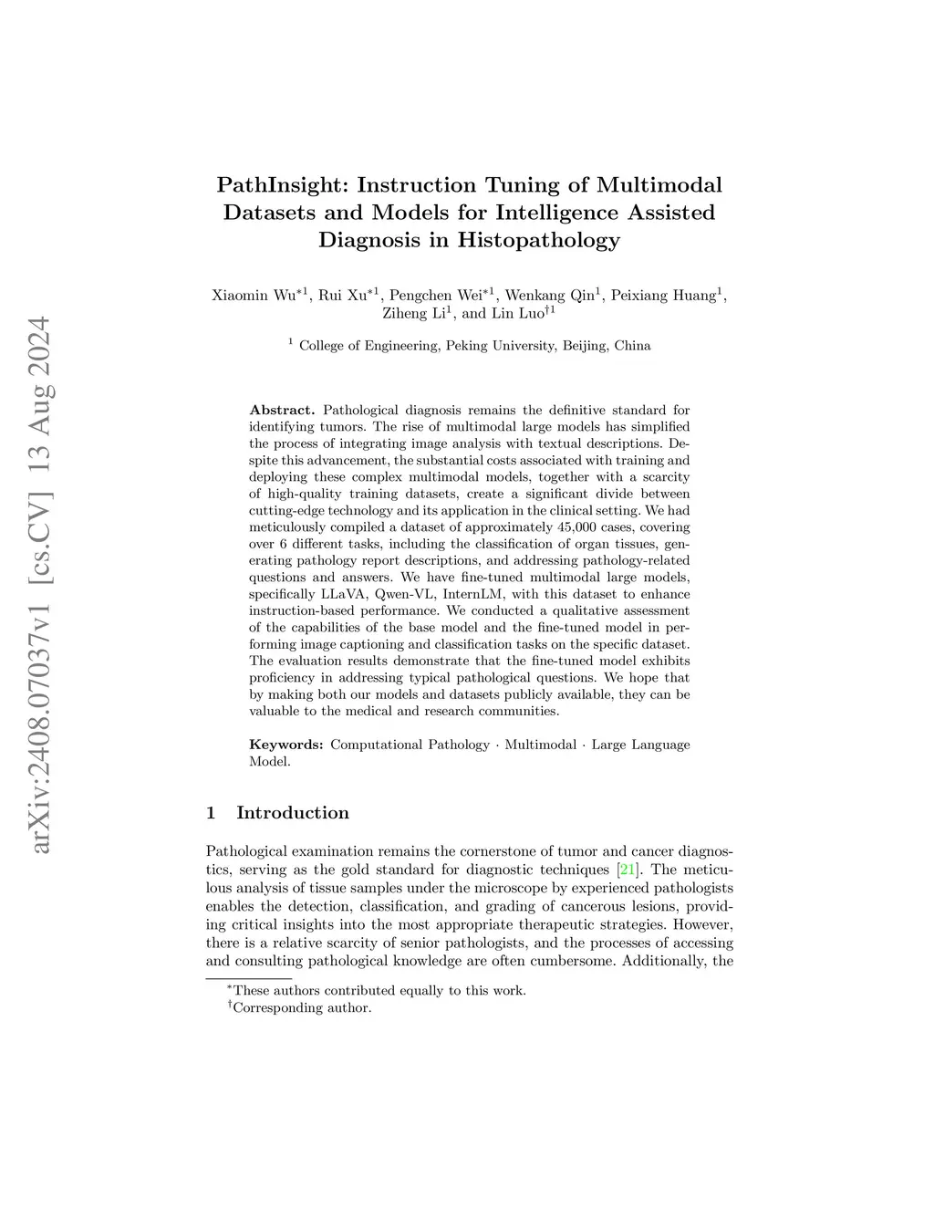 Pathological diagnosis remains the definitive standard for identifying tumors. The rise of multimodal large models has simplified the process of integrating image analysis with textual descriptions. Despite this advancement, the substantial costs associated with training and deploying these complex multimodal models, together with a scarcity of high-quality training datasets, create a significant divide between cutting-edge technology and its application in the clinical setting. We had meticulously compiled a dataset of approximately 45,000 cases, covering over 6 different tasks, including the classification of organ tissues, generating pathology report descriptions, and addressing pathology-related questions and answers. We have fine-tuned multimodal large models, specifically LLaVA, Qwen-VL, InternLM, with this dataset to enhance instruction-based performance. We conducted a qualitative assessment of the capabilities of the base model and the fine-tuned model in performing image captioning and classification tasks on the specific dataset. The evaluation results demonstrate that the fine-tuned model exhibits proficiency in addressing typical pathological questions. We hope that by making both our models and datasets publicly available, they can be valuable to the medical and research communities.