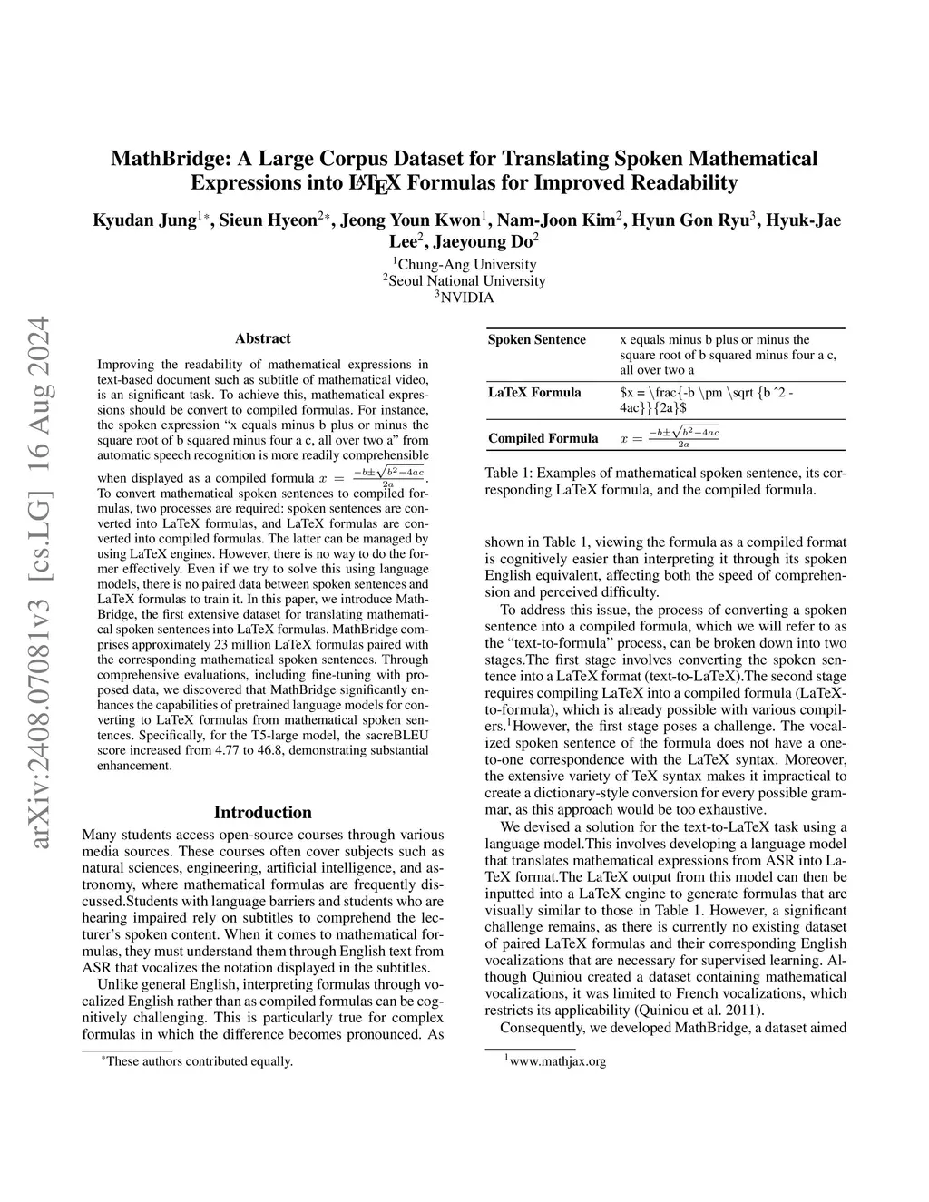 Improving the readability of mathematical expressions in text-based document such as subtitle of mathematical video, is an significant task. To achieve this, mathematical expressions should be convert to compiled formulas. For instance, the spoken expression ``x equals minus b plus or minus the square root of b squared minus four a c, all over two a'' from automatic speech recognition is more readily comprehensible when displayed as a compiled formula . To convert mathematical spoken sentences to compiled formulas, two processes are required: spoken sentences are converted into LaTeX formulas, and LaTeX formulas are converted into compiled formulas. The latter can be managed by using LaTeX engines. However, there is no way to do the former effectively. Even if we try to solve this using language models, there is no paired data between spoken sentences and LaTeX formulas to train it. In this paper, we introduce MathBridge, the first extensive dataset for translating mathematical spoken sentences into LaTeX formulas. MathBridge comprises approximately 23 million LaTeX formulas paired with the corresponding mathematical spoken sentences. Through comprehensive evaluations, including fine-tuning with proposed data, we discovered that MathBridge significantly enhances the capabilities of pretrained language models for converting to LaTeX formulas from mathematical spoken sentences. Specifically, for the T5-large model, the sacreBLEU score increased from 4.77 to 46.8, demonstrating substantial enhancement.