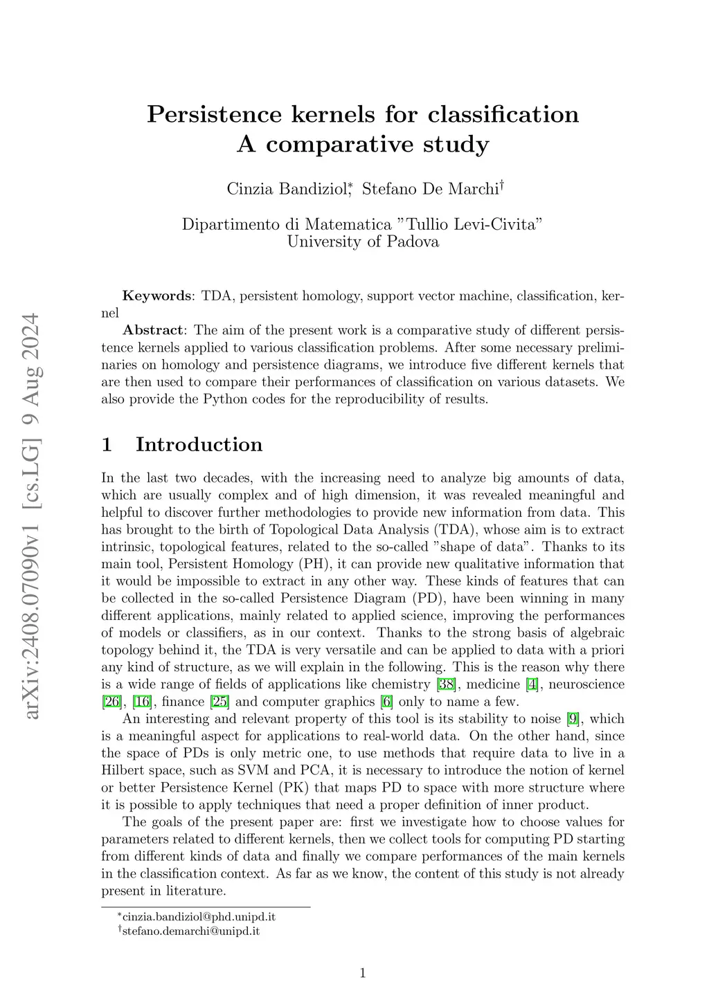 The aim of the present work is a comparative study of different persistence kernels applied to various classification problems. After some necessary preliminaries on homology and persistence diagrams, we introduce five different kernels that are then used to compare their performances of classification on various datasets. We also provide the Python codes for the reproducibility of results.