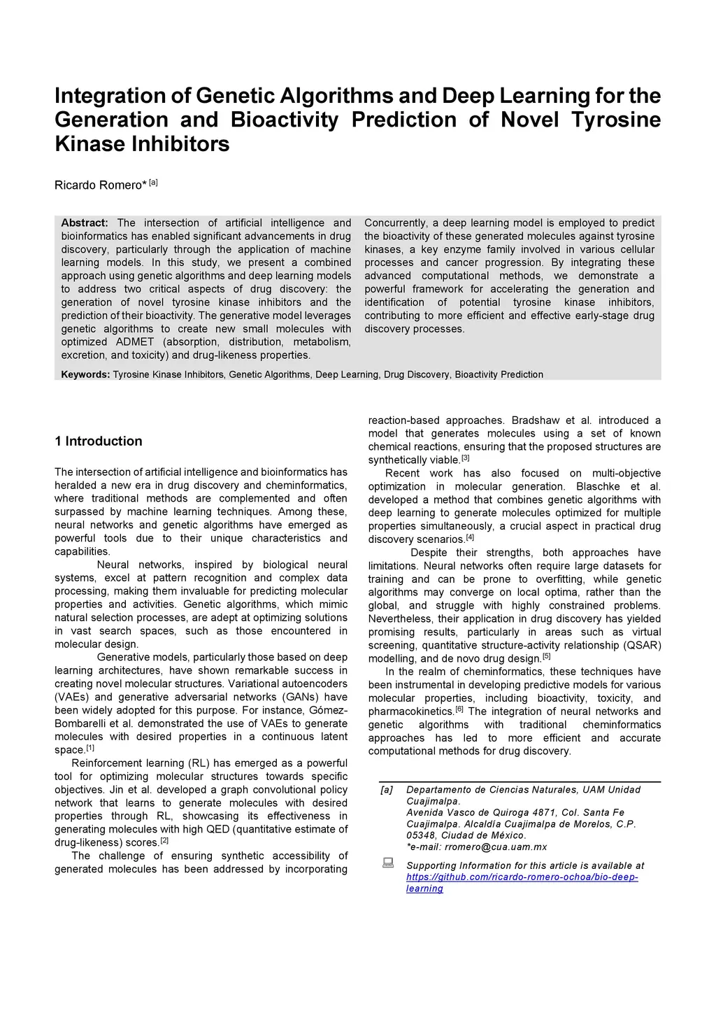 The intersection of artificial intelligence and bioinformatics has enabled significant advancements in drug discovery, particularly through the application of machine learning models. In this study, we present a combined approach using genetic algorithms and deep learning models to address two critical aspects of drug discovery: the generation of novel tyrosine kinase inhibitors and the prediction of their bioactivity. The generative model leverages genetic algorithms to create new small molecules with optimized ADMET (absorption, distribution, metabolism, excretion, and toxicity) and drug-likeness properties. Concurrently, a deep learning model is employed to predict the bioactivity of these generated molecules against tyrosine kinases, a key enzyme family involved in various cellular processes and cancer progression. By integrating these advanced computational methods, we demonstrate a powerful framework for accelerating the generation and identification of potential tyrosine kinase inhibitors, contributing to more efficient and effective early-stage drug discovery processes.