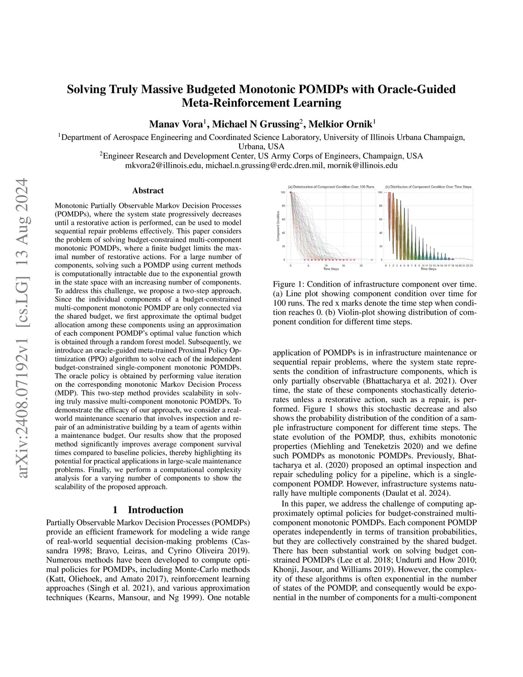Monotonic Partially Observable Markov Decision Processes (POMDPs), where the system state progressively decreases until a restorative action is performed, can be used to model sequential repair problems effectively. This paper considers the problem of solving budget-constrained multi-component monotonic POMDPs, where a finite budget limits the maximal number of restorative actions. For a large number of components, solving such a POMDP using current methods is computationally intractable due to the exponential growth in the state space with an increasing number of components. To address this challenge, we propose a two-step approach. Since the individual components of a budget-constrained multi-component monotonic POMDP are only connected via the shared budget, we first approximate the optimal budget allocation among these components using an approximation of each component POMDP's optimal value function which is obtained through a random forest model. Subsequently, we introduce an oracle-guided meta-trained Proximal Policy Optimization (PPO) algorithm to solve each of the independent budget-constrained single-component monotonic POMDPs. The oracle policy is obtained by performing value iteration on the corresponding monotonic Markov Decision Process (MDP). This two-step method provides scalability in solving truly massive multi-component monotonic POMDPs. To demonstrate the efficacy of our approach, we consider a real-world maintenance scenario that involves inspection and repair of an administrative building by a team of agents within a maintenance budget. Finally, we perform a computational complexity analysis for a varying number of components to show the scalability of the proposed approach.