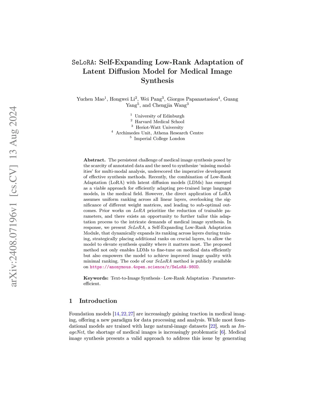 The persistent challenge of medical image synthesis posed by the scarcity of annotated data and the need to synthesize `missing modalities' for multi-modal analysis, underscored the imperative development of effective synthesis methods. Recently, the combination of Low-Rank Adaptation (LoRA) with latent diffusion models (LDMs) has emerged as a viable approach for efficiently adapting pre-trained large language models, in the medical field. However, the direct application of LoRA assumes uniform ranking across all linear layers, overlooking the significance of different weight matrices, and leading to sub-optimal outcomes. Prior works on LoRA prioritize the reduction of trainable parameters, and there exists an opportunity to further tailor this adaptation process to the intricate demands of medical image synthesis. In response, we present SeLoRA, a Self-Expanding Low-Rank Adaptation Module, that dynamically expands its ranking across layers during training, strategically placing additional ranks on crucial layers, to allow the model to elevate synthesis quality where it matters most. The proposed method not only enables LDMs to fine-tune on medical data efficiently but also empowers the model to achieve improved image quality with minimal ranking. The code of our SeLoRA method is publicly available on https://anonymous.4open.science/r/SeLoRA-980D .