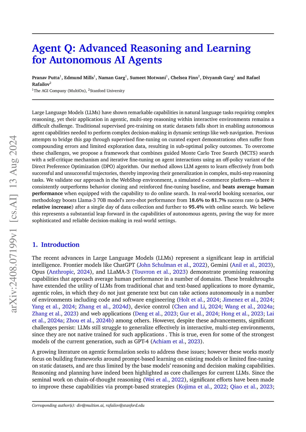 Agent Q: Advanced Reasoning and Learning for Autonomous AI Agents
