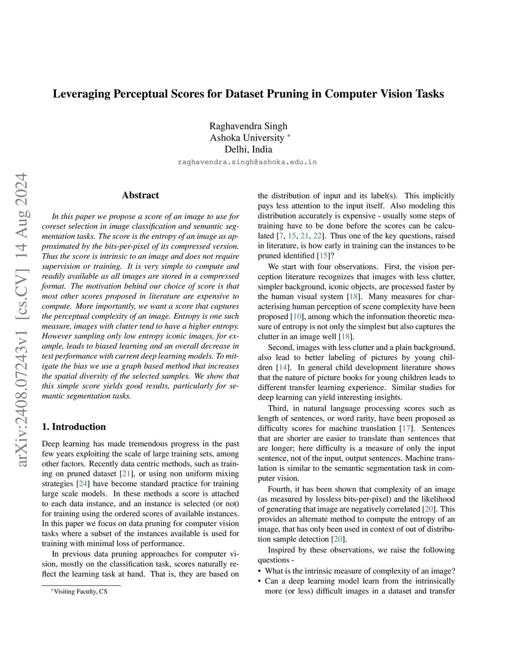 In this paper we propose a score of an image to use for coreset selection in image classification and semantic segmentation tasks. The score is the entropy of an image as approximated by the bits-per-pixel of its compressed version. Thus the score is intrinsic to an image and does not require supervision or training. It is very simple to compute and readily available as all images are stored in a compressed format. The motivation behind our choice of score is that most other scores proposed in literature are expensive to compute. More importantly, we want a score that captures the perceptual complexity of an image. Entropy is one such measure, images with clutter tend to have a higher entropy. However sampling only low entropy iconic images, for example, leads to biased learning and an overall decrease in test performance with current deep learning models. To mitigate the bias we use a graph based method that increases the spatial diversity of the selected samples. We show that this simple score yields good results, particularly for semantic segmentation tasks.