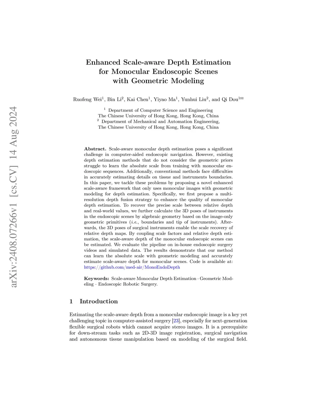 Scale-aware monocular depth estimation poses a significant challenge in computer-aided endoscopic navigation. However, existing depth estimation methods that do not consider the geometric priors struggle to learn the absolute scale from training with monocular endoscopic sequences. Additionally, conventional methods face difficulties in accurately estimating details on tissue and instruments boundaries. In this paper, we tackle these problems by proposing a novel enhanced scale-aware framework that only uses monocular images with geometric modeling for depth estimation. Specifically, we first propose a multi-resolution depth fusion strategy to enhance the quality of monocular depth estimation. To recover the precise scale between relative depth and real-world values, we further calculate the 3D poses of instruments in the endoscopic scenes by algebraic geometry based on the image-only geometric primitives (i.e., boundaries and tip of instruments). Afterwards, the 3D poses of surgical instruments enable the scale recovery of relative depth maps. By coupling scale factors and relative depth estimation, the scale-aware depth of the monocular endoscopic scenes can be estimated. We evaluate the pipeline on in-house endoscopic surgery videos and simulated data. The results demonstrate that our method can learn the absolute scale with geometric modeling and accurately estimate scale-aware depth for monocular scenes.