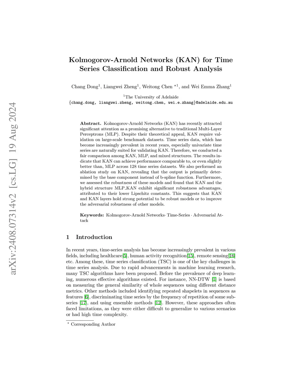 Kolmogorov-Arnold Networks (KAN) has recently attracted significant attention as a promising alternative to traditional Multi-Layer Perceptrons (MLP). Despite their theoretical appeal, KAN require validation on large-scale benchmark datasets. Time series data, which has become increasingly prevalent in recent years, especially univariate time series are naturally suited for validating KAN. Therefore, we conducted a fair comparison among KAN, MLP, and mixed structures. The results indicate that KAN can achieve performance comparable to, or even slightly better than, MLP across 128 time series datasets. We also performed an ablation study on KAN, revealing that the output is primarily determined by the base component instead of b-spline function. Furthermore, we assessed the robustness of these models and found that KAN and the hybrid structure MLP\_KAN exhibit significant robustness advantages, attributed to their lower Lipschitz constants. This suggests that KAN and KAN layers hold strong potential to be robust models or to improve the adversarial robustness of other models.