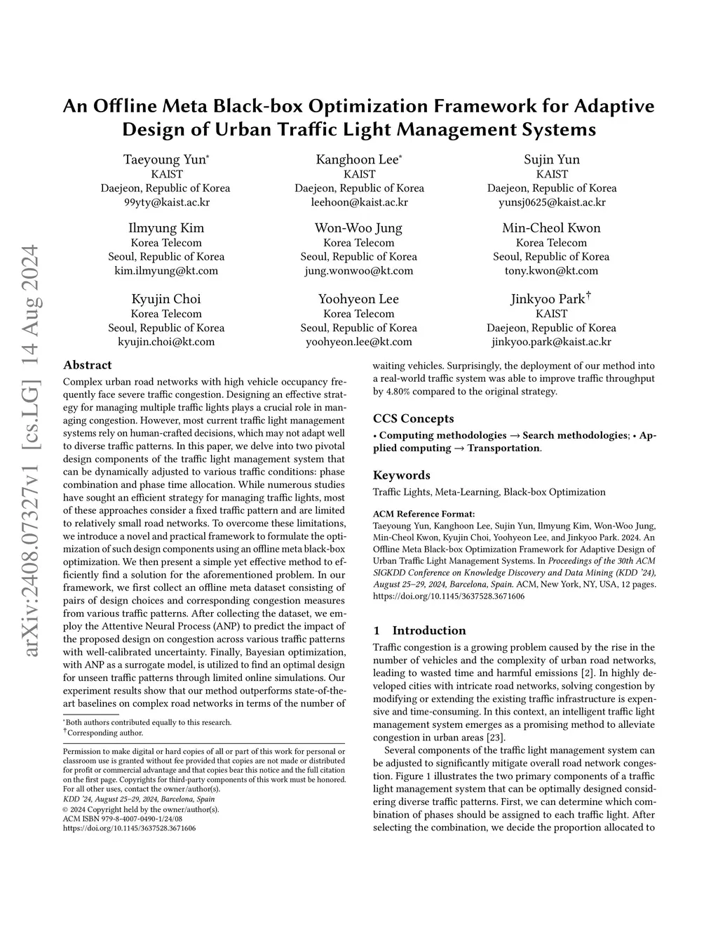 Complex urban road networks with high vehicle occupancy frequently face severe traffic congestion. Designing an effective strategy for managing multiple traffic lights plays a crucial role in managing congestion. However, most current traffic light management systems rely on human-crafted decisions, which may not adapt well to diverse traffic patterns. In this paper, we delve into two pivotal design components of the traffic light management system that can be dynamically adjusted to various traffic conditions: phase combination and phase time allocation. While numerous studies have sought an efficient strategy for managing traffic lights, most of these approaches consider a fixed traffic pattern and are limited to relatively small road networks. To overcome these limitations, we introduce a novel and practical framework to formulate the optimization of such design components using an offline meta black-box optimization. We then present a simple yet effective method to efficiently find a solution for the aforementioned problem. In our framework, we first collect an offline meta dataset consisting of pairs of design choices and corresponding congestion measures from various traffic patterns. After collecting the dataset, we employ the Attentive Neural Process (ANP) to predict the impact of the proposed design on congestion across various traffic patterns with well-calibrated uncertainty. Finally, Bayesian optimization, with ANP as a surrogate model, is utilized to find an optimal design for unseen traffic patterns through limited online simulations. Our experiment results show that our method outperforms state-of-the-art baselines on complex road networks in terms of the number of waiting vehicles. Surprisingly, the deployment of our method into a real-world traffic system was able to improve traffic throughput by 4.80\% compared to the original strategy.