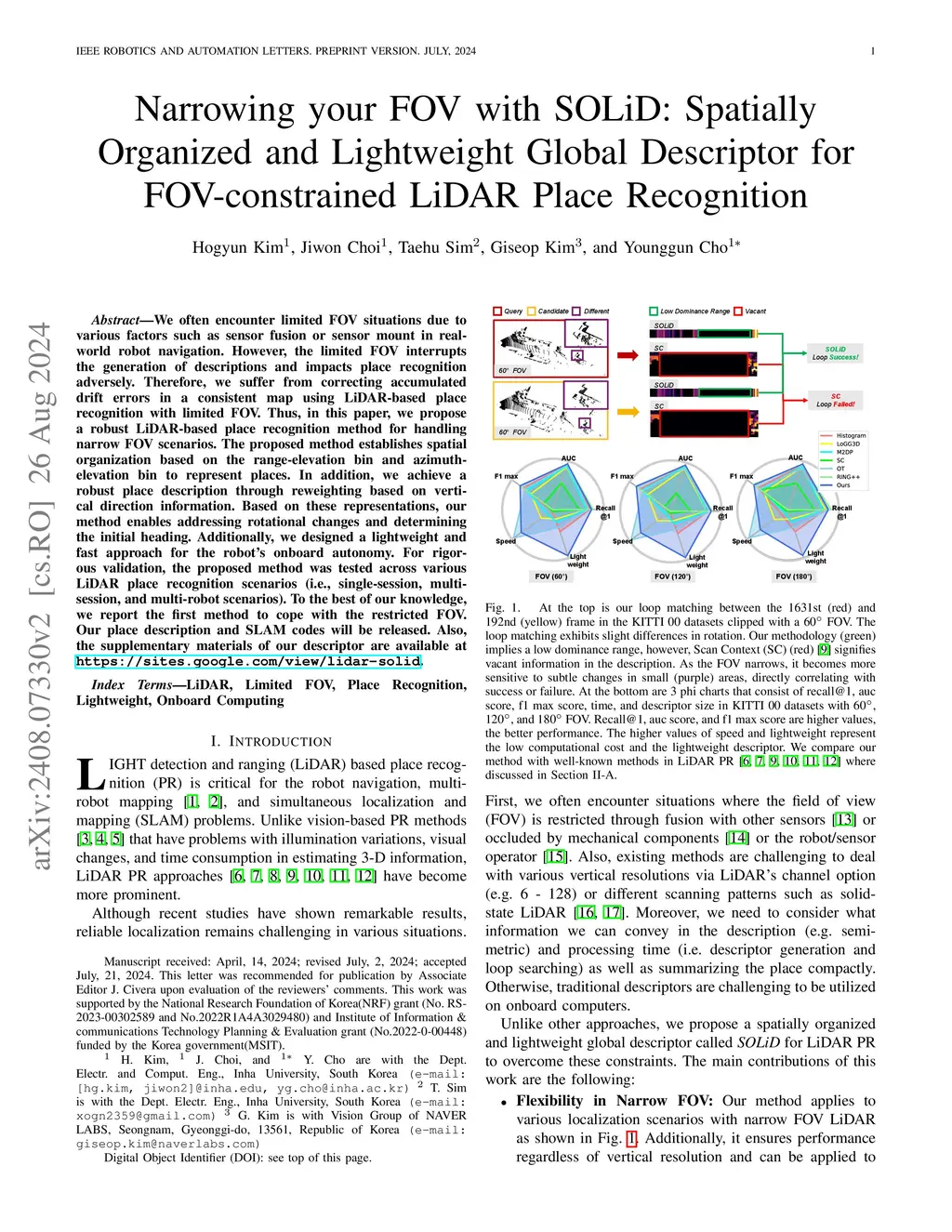 We often encounter limited FOV situations due to various factors such as sensor fusion or sensor mount in real-world robot navigation. However, the limited FOV interrupts the generation of descriptions and impacts place recognition adversely. Therefore, we suffer from correcting accumulated drift errors in a consistent map using LiDAR-based place recognition with limited FOV. Thus, in this paper, we propose a robust LiDAR-based place recognition method for handling narrow FOV scenarios. The proposed method establishes spatial organization based on the range-elevation bin and azimuth-elevation bin to represent places. In addition, we achieve a robust place description through reweighting based on vertical direction information. Based on these representations, our method enables addressing rotational changes and determining the initial heading. Additionally, we designed a lightweight and fast approach for the robot's onboard autonomy. For rigorous validation, the proposed method was tested across various LiDAR place recognition scenarios (i.e., single-session, multi-session, and multi-robot scenarios). To the best of our knowledge, we report the first method to cope with the restricted FOV. Our place description and SLAM codes will be released. Also, the supplementary materials of our descriptor are available at \texttt{\url{https://sites.google.com/view/lidar-solid}}.