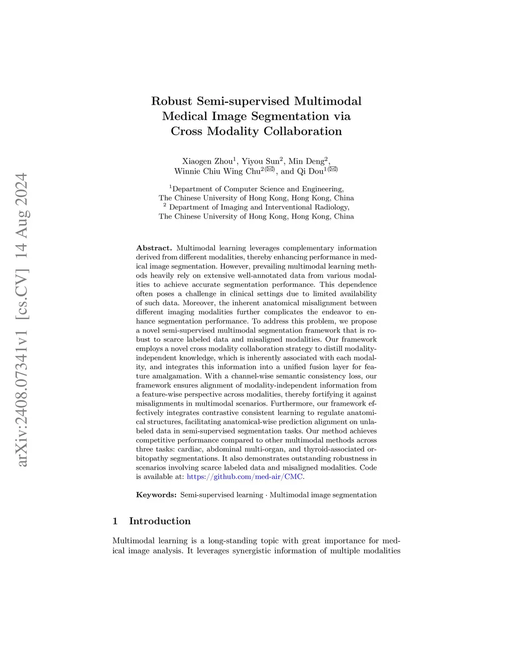 Multimodal learning leverages complementary information derived from different modalities, thereby enhancing performance in medical image segmentation. However, prevailing multimodal learning methods heavily rely on extensive well-annotated data from various modalities to achieve accurate segmentation performance. This dependence often poses a challenge in clinical settings due to limited availability of such data. Moreover, the inherent anatomical misalignment between different imaging modalities further complicates the endeavor to enhance segmentation performance. To address this problem, we propose a novel semi-supervised multimodal segmentation framework that is robust to scarce labeled data and misaligned modalities. Our framework employs a novel cross modality collaboration strategy to distill modality-independent knowledge, which is inherently associated with each modality, and integrates this information into a unified fusion layer for feature amalgamation. With a channel-wise semantic consistency loss, our framework ensures alignment of modality-independent information from a feature-wise perspective across modalities, thereby fortifying it against misalignments in multimodal scenarios. Furthermore, our framework effectively integrates contrastive consistent learning to regulate anatomical structures, facilitating anatomical-wise prediction alignment on unlabeled data in semi-supervised segmentation tasks. Our method achieves competitive performance compared to other multimodal methods across three tasks: cardiac, abdominal multi-organ, and thyroid-associated orbitopathy segmentations. It also demonstrates outstanding robustness in scenarios involving scarce labeled data and misaligned modalities.