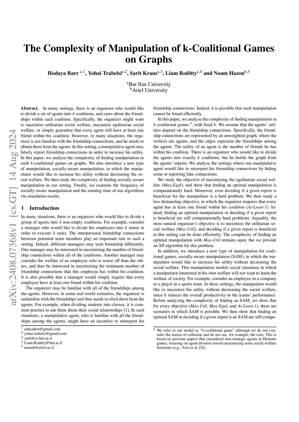 In many settings, there is an organizer who would like to divide a set of agents into coalitions, and cares about the friendships within each coalition. Specifically, the organizer might want to maximize utilitarian social welfare, maximize egalitarian social welfare, or simply guarantee that every agent will have at least one friend within his coalition. However, in many situations, the organizer is not familiar with the friendship connections, and he needs to obtain them from the agents. In this setting, a manipulative agent may falsely report friendship connections in order to increase his utility. In this paper, we analyze the complexity of finding manipulation in such -coalitional games on graphs. We also introduce a new type of manipulation, socially-aware manipulation, in which the manipulator would like to increase his utility without decreasing the social welfare. We then study the complexity of finding socially-aware manipulation in our setting. Finally, we examine the frequency of socially-aware manipulation and the running time of our algorithms via simulation results.