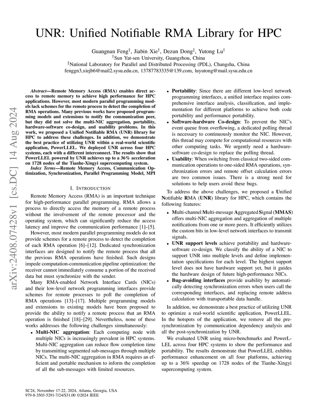 Remote Memory Access (RMA) enables direct access to remote memory to achieve high performance for HPC applications. However, most modern parallel programming models lack schemes for the remote process to detect the completion of RMA operations. Many previous works have proposed programming models and extensions to notify the communication peer, but they did not solve the multi-NIC aggregation, portability, hardware-software co-design, and usability problems. In this work, we proposed a Unified Notifiable RMA (UNR) library for HPC to address these challenges. In addition, we demonstrate the best practice of utilizing UNR within a real-world scientific application, PowerLLEL. We deployed UNR across four HPC systems, each with a different interconnect. The results show that PowerLLEL powered by UNR achieves up to a 36% acceleration on 1728 nodes of the Tianhe-Xingyi supercomputing system.