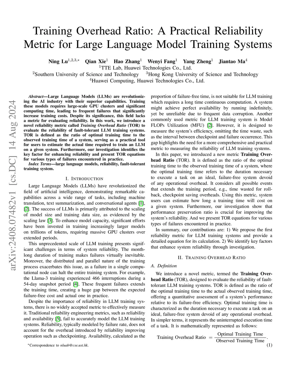 Large Language Models (LLMs) are revolutionizing the AI industry with their superior capabilities. Training these models requires large-scale GPU clusters and significant computing time, leading to frequent failures that significantly increase training costs. Despite its significance, this field lacks a metric for evaluating reliability. In this work, we introduce a novel reliability metric called \emph{Training Overhead Ratio} (TOR) to evaluate the reliability of fault-tolerant LLM training systems. TOR is defined as the ratio of optimal training time to the observed training time of a system, serving as a practical tool for users to estimate the actual time required to train an LLM on a given system. Furthermore, our investigation identifies the key factor for enhancing reliability and present TOR equations for various types of failures encountered in practice.
