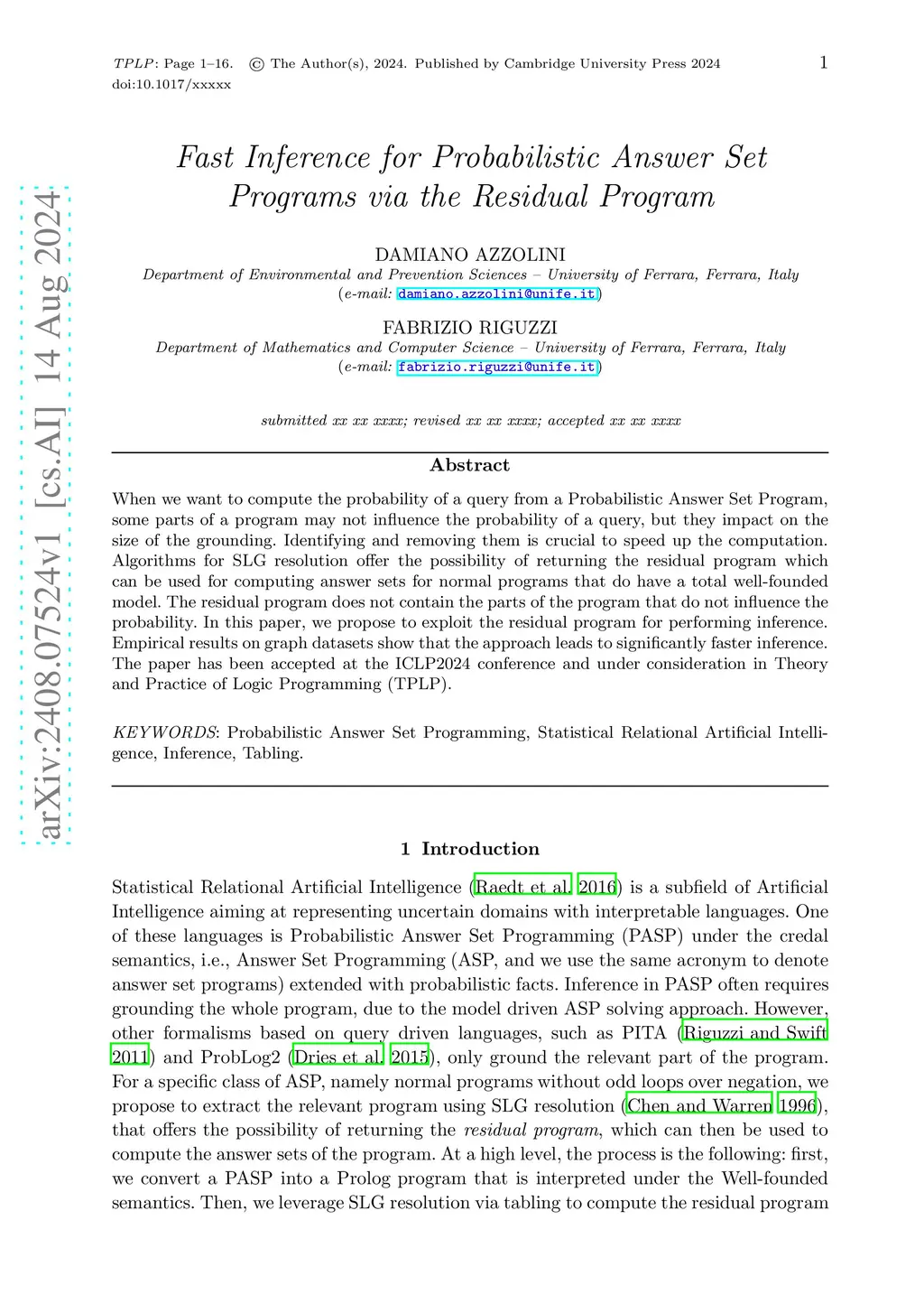 Fast Inference for Probabilistic Answer Set Programs via the Residual