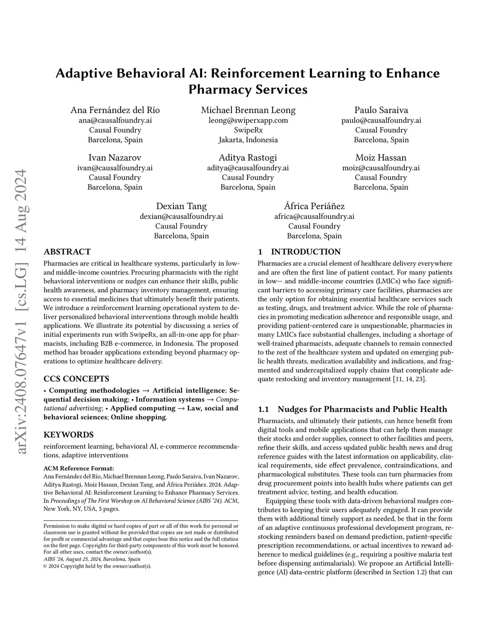 Pharmacies are critical in healthcare systems, particularly in low- and middle-income countries. Procuring pharmacists with the right behavioral interventions or nudges can enhance their skills, public health awareness, and pharmacy inventory management, ensuring access to essential medicines that ultimately benefit their patients. We introduce a reinforcement learning operational system to deliver personalized behavioral interventions through mobile health applications. We illustrate its potential by discussing a series of initial experiments run with SwipeRx, an all-in-one app for pharmacists, including B2B e-commerce, in Indonesia. The proposed method has broader applications extending beyond pharmacy operations to optimize healthcare delivery.