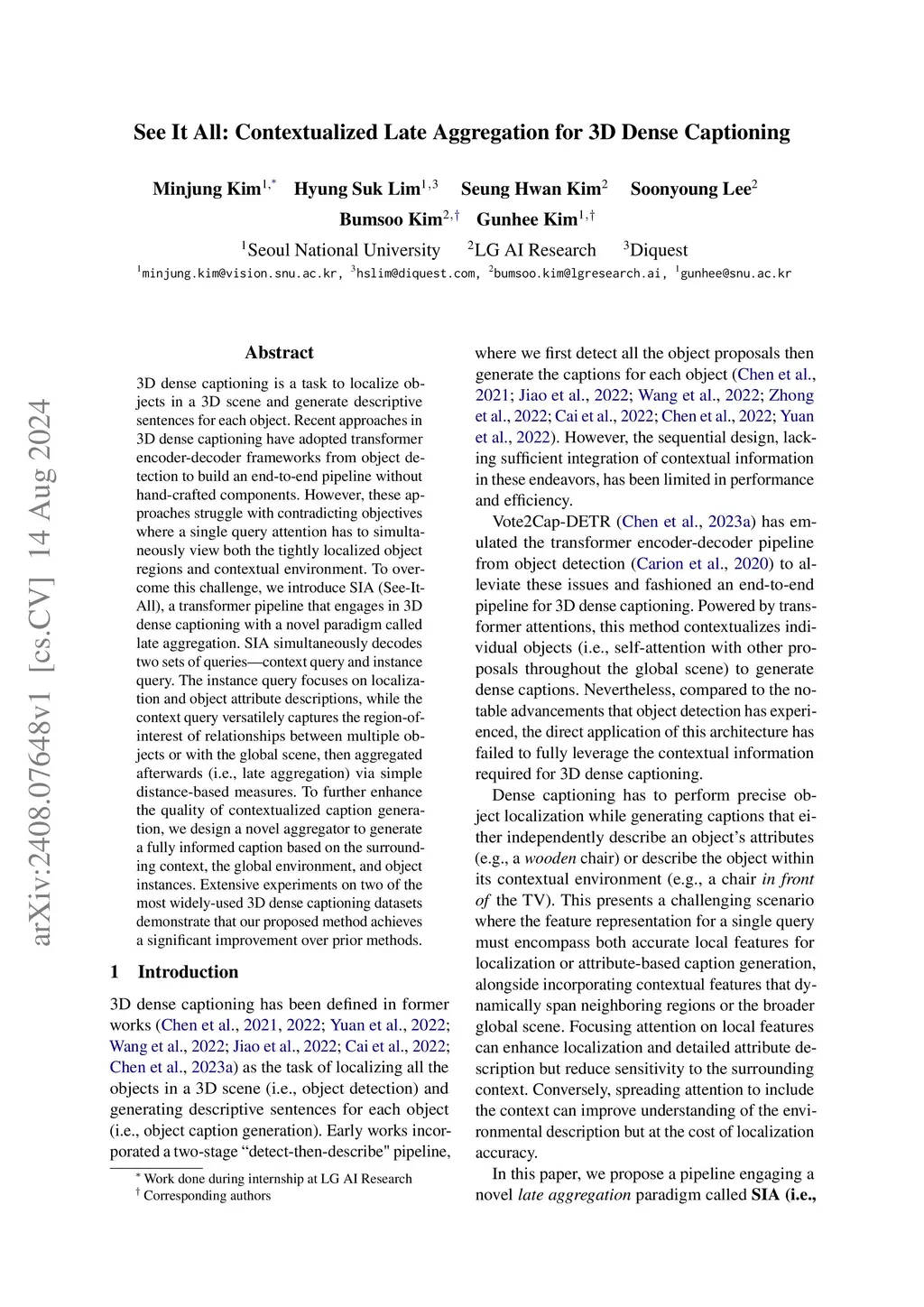 3D dense captioning is a task to localize objects in a 3D scene and generate descriptive sentences for each object. Recent approaches in 3D dense captioning have adopted transformer encoder-decoder frameworks from object detection to build an end-to-end pipeline without hand-crafted components. However, these approaches struggle with contradicting objectives where a single query attention has to simultaneously view both the tightly localized object regions and contextual environment. To overcome this challenge, we introduce SIA (See-It-All), a transformer pipeline that engages in 3D dense captioning with a novel paradigm called late aggregation. SIA simultaneously decodes two sets of queries-context query and instance query. The instance query focuses on localization and object attribute descriptions, while the context query versatilely captures the region-of-interest of relationships between multiple objects or with the global scene, then aggregated afterwards (i.e., late aggregation) via simple distance-based measures. To further enhance the quality of contextualized caption generation, we design a novel aggregator to generate a fully informed caption based on the surrounding context, the global environment, and object instances. Extensive experiments on two of the most widely-used 3D dense captioning datasets demonstrate that our proposed method achieves a significant improvement over prior methods.