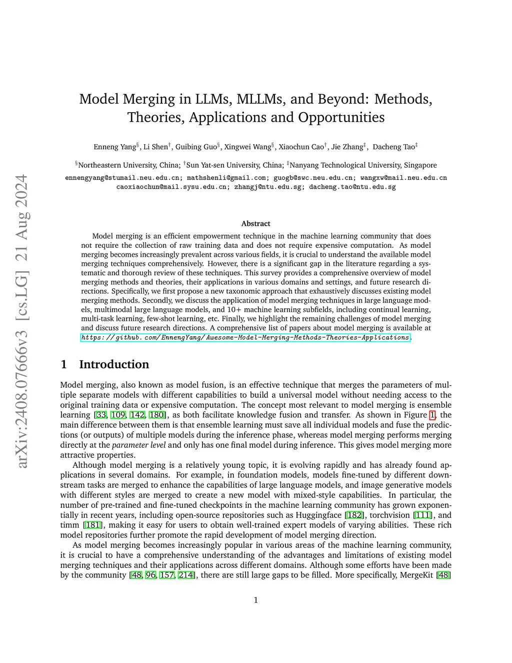 Model merging is an efficient empowerment technique in the machine learning community that does not require the collection of raw training data and does not require expensive computation. As model merging becomes increasingly prevalent across various fields, it is crucial to understand the available model merging techniques comprehensively. However, there is a significant gap in the literature regarding a systematic and thorough review of these techniques. This survey provides a comprehensive overview of model merging methods and theories, their applications in various domains and settings, and future research directions. Specifically, we first propose a new taxonomic approach that exhaustively discusses existing model merging methods. Secondly, we discuss the application of model merging techniques in large language models, multimodal large language models, and more than ten machine learning subfields, including continual learning, multi-task learning, few-shot learning, etc. Finally, we highlight the remaining challenges of model merging and discuss future research directions. A comprehensive list of papers about model merging is available atthis https URL.
