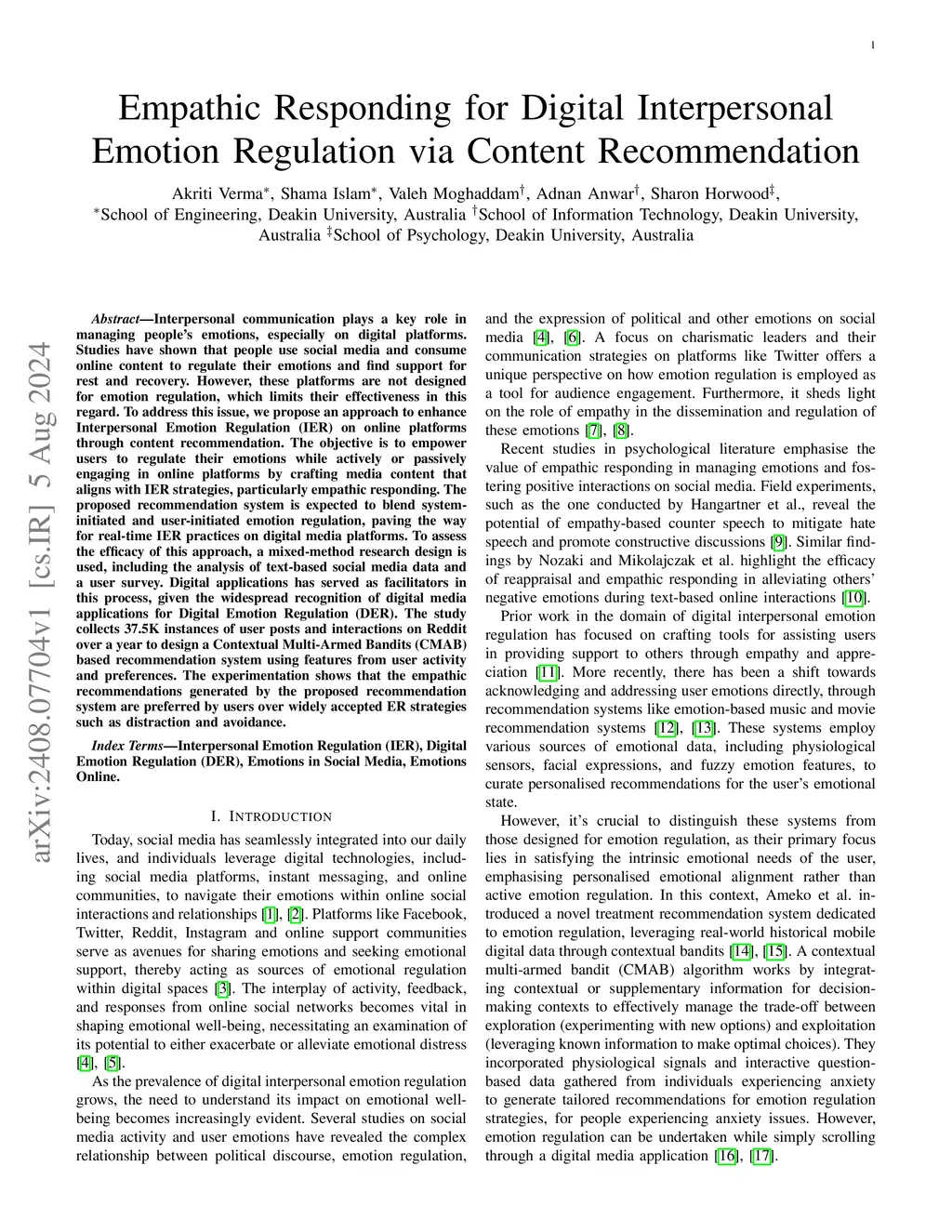 Interpersonal communication plays a key role in managing people's emotions, especially on digital platforms. Studies have shown that people use social media and consume online content to regulate their emotions and find support for rest and recovery. However, these platforms are not designed for emotion regulation, which limits their effectiveness in this regard. To address this issue, we propose an approach to enhance Interpersonal Emotion Regulation (IER) on online platforms through content recommendation. The objective is to empower users to regulate their emotions while actively or passively engaging in online platforms by crafting media content that aligns with IER strategies, particularly empathic responding. The proposed recommendation system is expected to blend system-initiated and user-initiated emotion regulation, paving the way for real-time IER practices on digital media platforms. To assess the efficacy of this approach, a mixed-method research design is used, including the analysis of text-based social media data and a user survey. Digital applications has served as facilitators in this process, given the widespread recognition of digital media applications for Digital Emotion Regulation (DER). The study collects 37.5K instances of user posts and interactions on Reddit over a year to design a Contextual Multi-Armed Bandits (CMAB) based recommendation system using features from user activity and preferences. The experimentation shows that the empathic recommendations generated by the proposed recommendation system are preferred by users over widely accepted ER strategies such as distraction and avoidance.