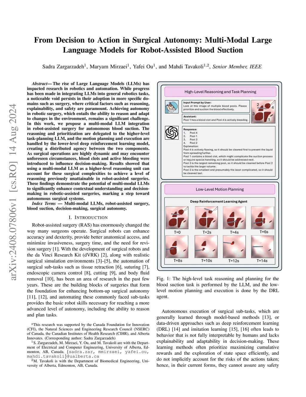 The rise of Large Language Models (LLMs) has impacted research in robotics and automation. While progress has been made in integrating LLMs into general robotics tasks, a noticeable void persists in their adoption in more specific domains such as surgery, where critical factors such as reasoning, explainability, and safety are paramount. Achieving autonomy in robotic surgery, which entails the ability to reason and adapt to changes in the environment, remains a significant challenge. In this work, we propose a multi-modal LLM integration in robot-assisted surgery for autonomous blood suction. The reasoning and prioritization are delegated to the higher-level task-planning LLM, and the motion planning and execution are handled by the lower-level deep reinforcement learning model, creating a distributed agency between the two components. As surgical operations are highly dynamic and may encounter unforeseen circumstances, blood clots and active bleeding were introduced to influence decision-making. Results showed that using a multi-modal LLM as a higher-level reasoning unit can account for these surgical complexities to achieve a level of reasoning previously unattainable in robot-assisted surgeries. These findings demonstrate the potential of multi-modal LLMs to significantly enhance contextual understanding and decision-making in robotic-assisted surgeries, marking a step toward autonomous surgical systems.