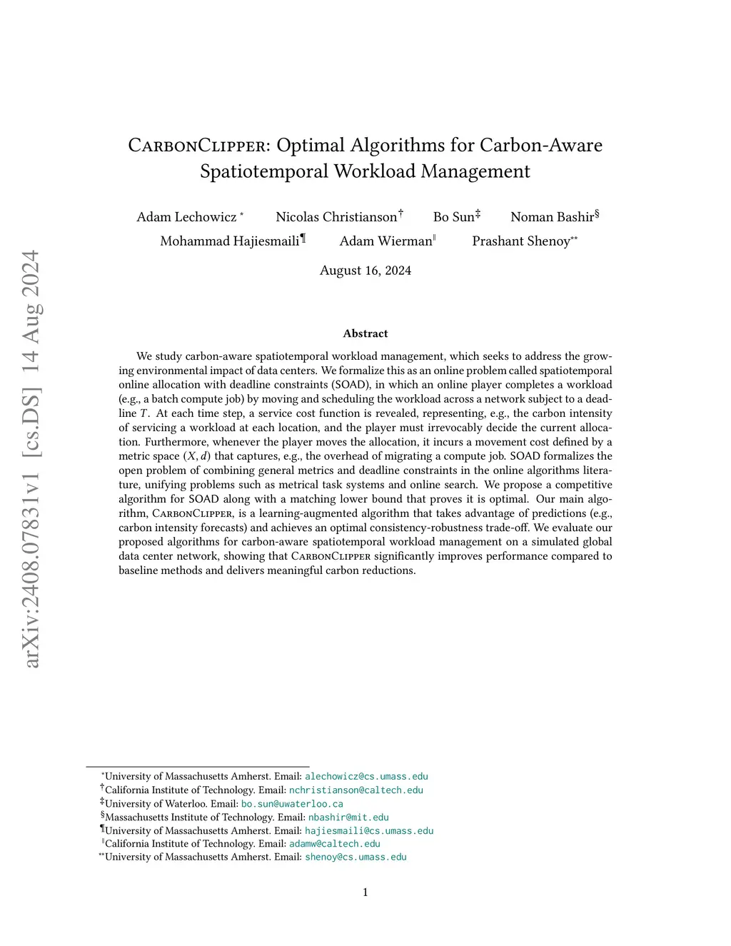 We introduce and study spatiotemporal online allocation with deadline constraints (), a new online problem motivated by emerging challenges in sustainability and energy. In , an online player completes a workload by allocating and scheduling it on the points of a metric space while subject to a deadline . At each time step, a service cost function is revealed that represents the cost of servicing the workload at each point, and the player must irrevocably decide the current allocation of work to points. Whenever the player moves this allocation, they incur a movement cost defined by the distance metric that captures, e.g., an overhead cost. formalizes the open problem of combining general metrics and deadline constraints in the online algorithms literature, unifying problems such as metrical task systems and online search. We propose a competitive algorithm for along with a matching lower bound establishing its optimality. Our main algorithm, \textsc{ST-CLIP}, is a learning-augmented algorithm that takes advantage of predictions (e.g., forecasts of relevant costs) and achieves an optimal consistency-robustness trade-off. We evaluate our proposed algorithms in a simulated case study of carbon-aware spatiotemporal workload management, an application in sustainable computing that schedules a delay-tolerant batch compute job on a distributed network of data centers. In these experiments, we show that \textsc{ST-CLIP} substantially improves on heuristic baseline methods.
