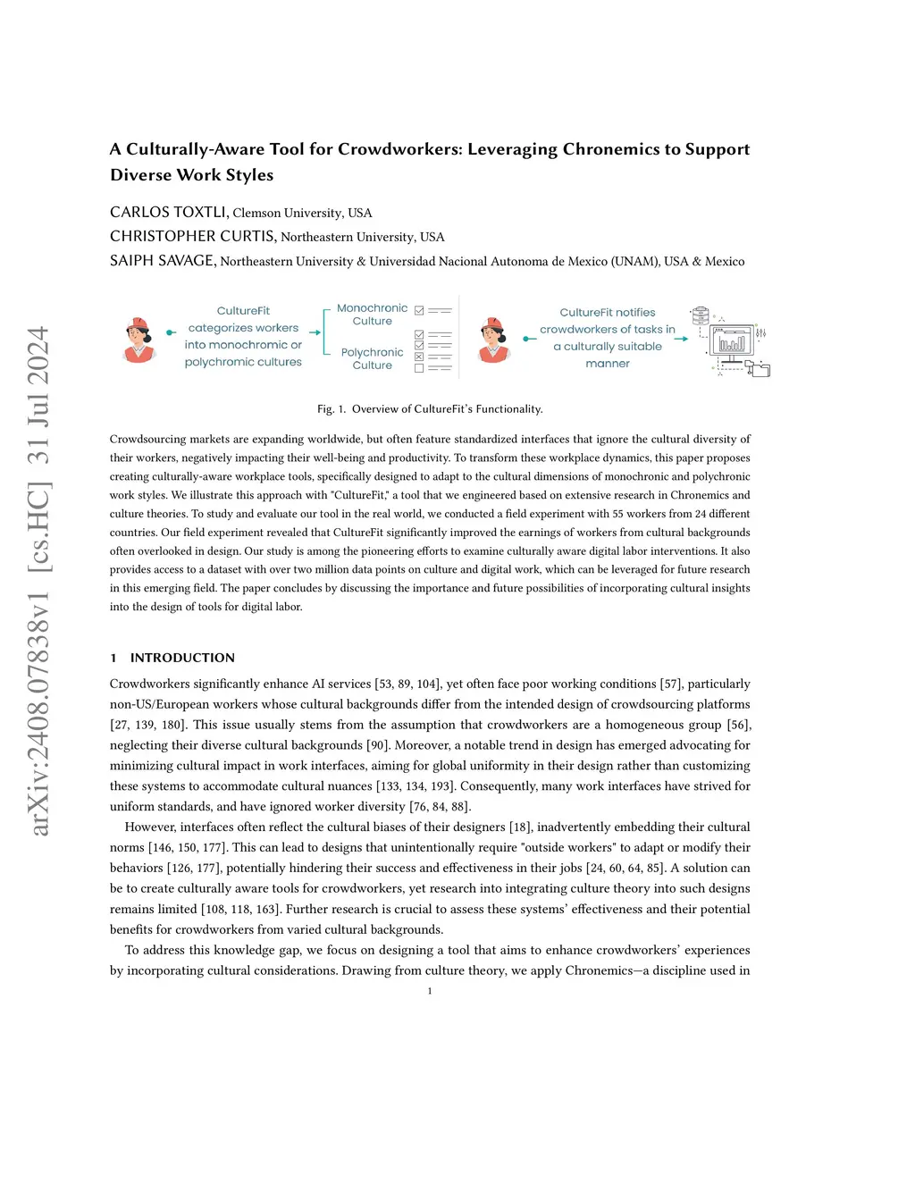 Crowdsourcing markets are expanding worldwide, but often feature standardized interfaces that ignore the cultural diversity of their workers, negatively impacting their well-being and productivity. To transform these workplace dynamics, this paper proposes creating culturally-aware workplace tools, specifically designed to adapt to the cultural dimensions of monochronic and polychronic work styles. We illustrate this approach with "CultureFit," a tool that we engineered based on extensive research in Chronemics and culture theories. To study and evaluate our tool in the real world, we conducted a field experiment with 55 workers from 24 different countries. Our field experiment revealed that CultureFit significantly improved the earnings of workers from cultural backgrounds often overlooked in design. Our study is among the pioneering efforts to examine culturally aware digital labor interventions. It also provides access to a dataset with over two million data points on culture and digital work, which can be leveraged for future research in this emerging field. The paper concludes by discussing the importance and future possibilities of incorporating cultural insights into the design of tools for digital labor.