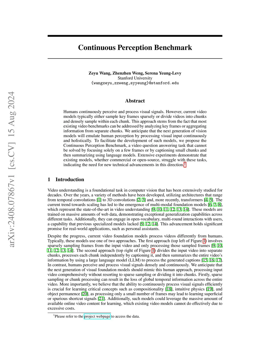Continuous perception, the ability to integrate visual observations over time in a continuous stream fashion, is essential for robust real-world understanding, yet remains largely untested in current multimodal models. We introduce CP-Bench, a minimal and fully controlled benchmark designed to isolate this capability using an extremely simple task: counting identical cubes in a synthetic scene while the camera moves and only reveals subsets of objects at any moment. Despite the simplicity of the setting, we find that state-of-the-art open-source and commercial models, including Qwen-3-VL, InternVL3, GPT-5, and Gemini-3-Pro, fail dramatically. A static-camera control variant confirms that the failure arises not from object recognition but from an inability to accumulate evidence across time. Further experiments show that neither higher sampling FPS, perception- or spatial-enhanced models, nor finetuning with additional videos leads to meaningful cross-temporal generalization. Our results reveal a fundamental limitation in modern multimodal architectures and training paradigms. CP-Bench provides a simple yet powerful diagnostic tool and establishes a clean testbed for developing models capable of genuine time-consistent visual reasoning.