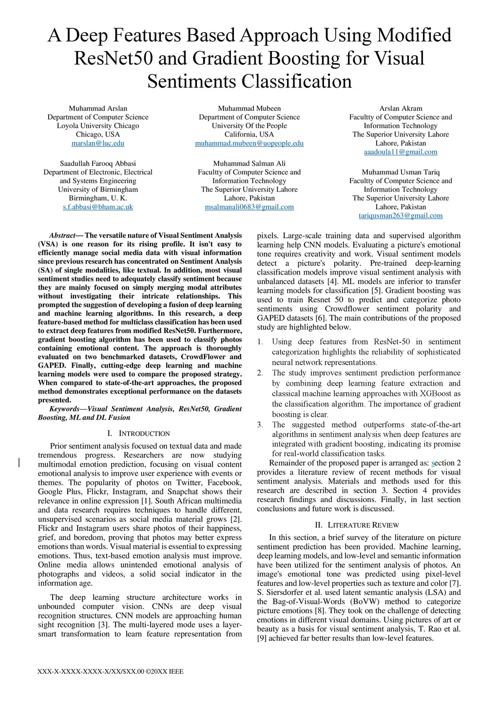 The versatile nature of Visual Sentiment Analysis (VSA) is one reason for its rising profile. It isn't easy to efficiently manage social media data with visual information since previous research has concentrated on Sentiment Analysis (SA) of single modalities, like textual. In addition, most visual sentiment studies need to adequately classify sentiment because they are mainly focused on simply merging modal attributes without investigating their intricate relationships. This prompted the suggestion of developing a fusion of deep learning and machine learning algorithms. In this research, a deep feature-based method for multiclass classification has been used to extract deep features from modified ResNet50. Furthermore, gradient boosting algorithm has been used to classify photos containing emotional content. The approach is thoroughly evaluated on two benchmarked datasets, CrowdFlower and GAPED. Finally, cutting-edge deep learning and machine learning models were used to compare the proposed strategy. When compared to state-of-the-art approaches, the proposed method demonstrates exceptional performance on the datasets presented.