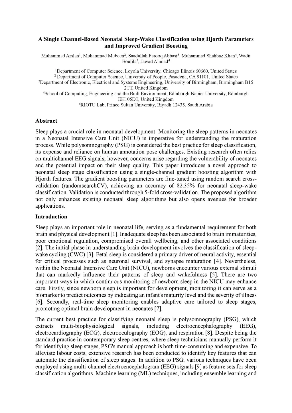 A Single Channel-Based Neonatal Sleep-Wake Classification using Hjorth