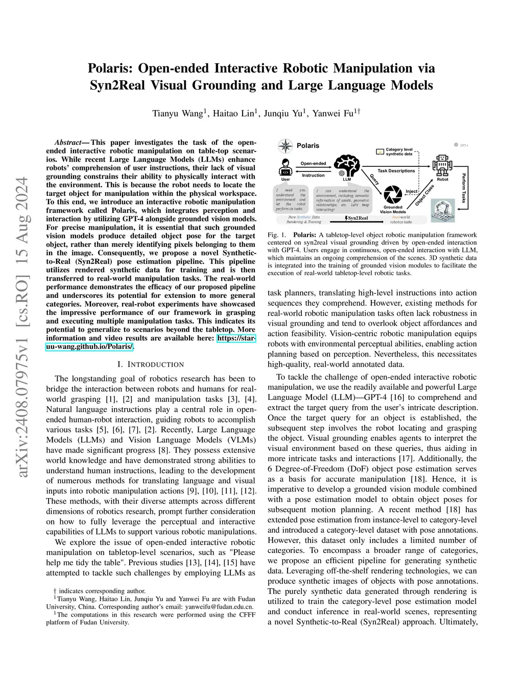 This paper investigates the task of the open-ended interactive robotic manipulation on table-top scenarios. While recent Large Language Models (LLMs) enhance robots' comprehension of user instructions, their lack of visual grounding constrains their ability to physically interact with the environment. This is because the robot needs to locate the target object for manipulation within the physical workspace. To this end, we introduce an interactive robotic manipulation framework called Polaris, which integrates perception and interaction by utilizing GPT-4 alongside grounded vision models. For precise manipulation, it is essential that such grounded vision models produce detailed object pose for the target object, rather than merely identifying pixels belonging to them in the image. Consequently, we propose a novel Synthetic-to-Real (Syn2Real) pose estimation pipeline. This pipeline utilizes rendered synthetic data for training and is then transferred to real-world manipulation tasks. The real-world performance demonstrates the efficacy of our proposed pipeline and underscores its potential for extension to more general categories. Moreover, real-robot experiments have showcased the impressive performance of our framework in grasping and executing multiple manipulation tasks. This indicates its potential to generalize to scenarios beyond the tabletop. More information and video results are available here: https://star-uu-wang.github.io/Polaris/