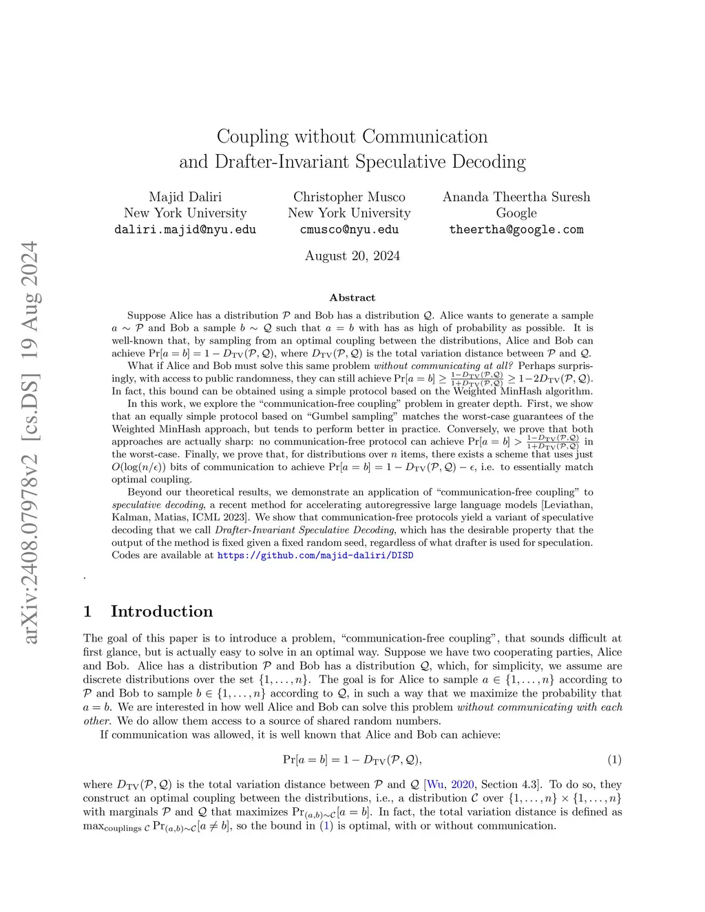 Coupling without Communication and Drafter-Invariant Speculative Decoding