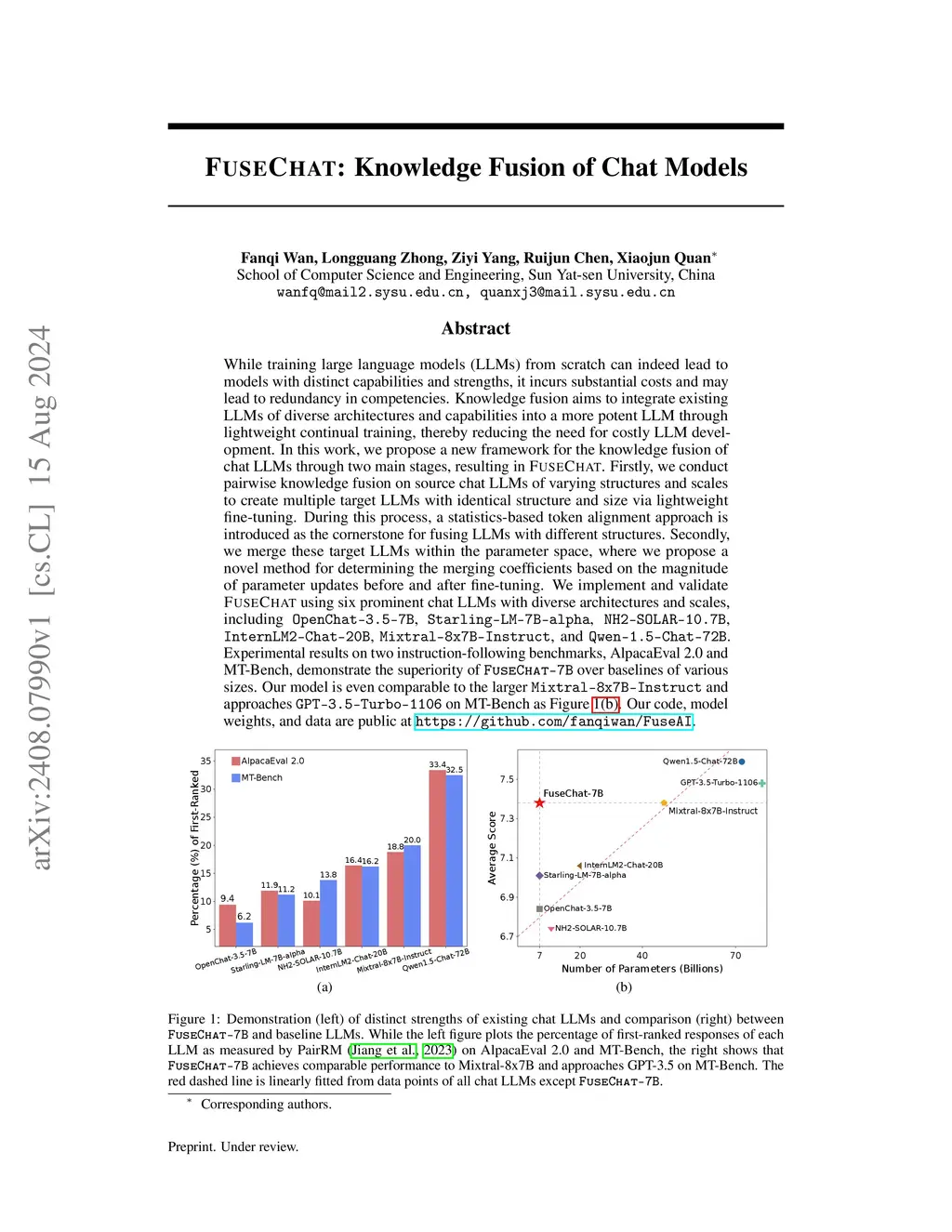 While training large language models (LLMs) from scratch can indeed lead to models with distinct capabilities and strengths, it incurs substantial costs and may lead to redundancy in competencies. Knowledge fusion aims to integrate existing LLMs of diverse architectures and capabilities into a more potent LLM through lightweight continual training, thereby reducing the need for costly LLM development. In this work, we propose a new framework for the knowledge fusion of chat LLMs through two main stages, resulting in FuseChat. Firstly, we conduct pairwise knowledge fusion on source chat LLMs of varying structures and scales to create multiple target LLMs with identical structure and size via lightweight fine-tuning. During this process, a statistics-based token alignment approach is introduced as the cornerstone for fusing LLMs with different structures. Secondly, we merge these target LLMs within the parameter space, where we propose a novel method for determining the merging coefficients based on the magnitude of parameter updates before and after fine-tuning. We implement and validate FuseChat using six prominent chat LLMs with diverse architectures and scales, including OpenChat-3.5-7B, Starling-LM-7B-alpha, NH2-SOLAR-10.7B, InternLM2-Chat-20B, Mixtral-8x7B-Instruct, and Qwen-1.5-Chat-72B. Experimental results on two instruction-following benchmarks, AlpacaEval 2.0 and MT-Bench, demonstrate the superiority of FuseChat-7B over baselines of various sizes. Our model is even comparable to the larger Mixtral-8x7B-Instruct and approaches GPT-3.5-Turbo-1106 on MT-Bench. Our code, model weights, and data are public at \url{https://github.com/fanqiwan/FuseAI}.