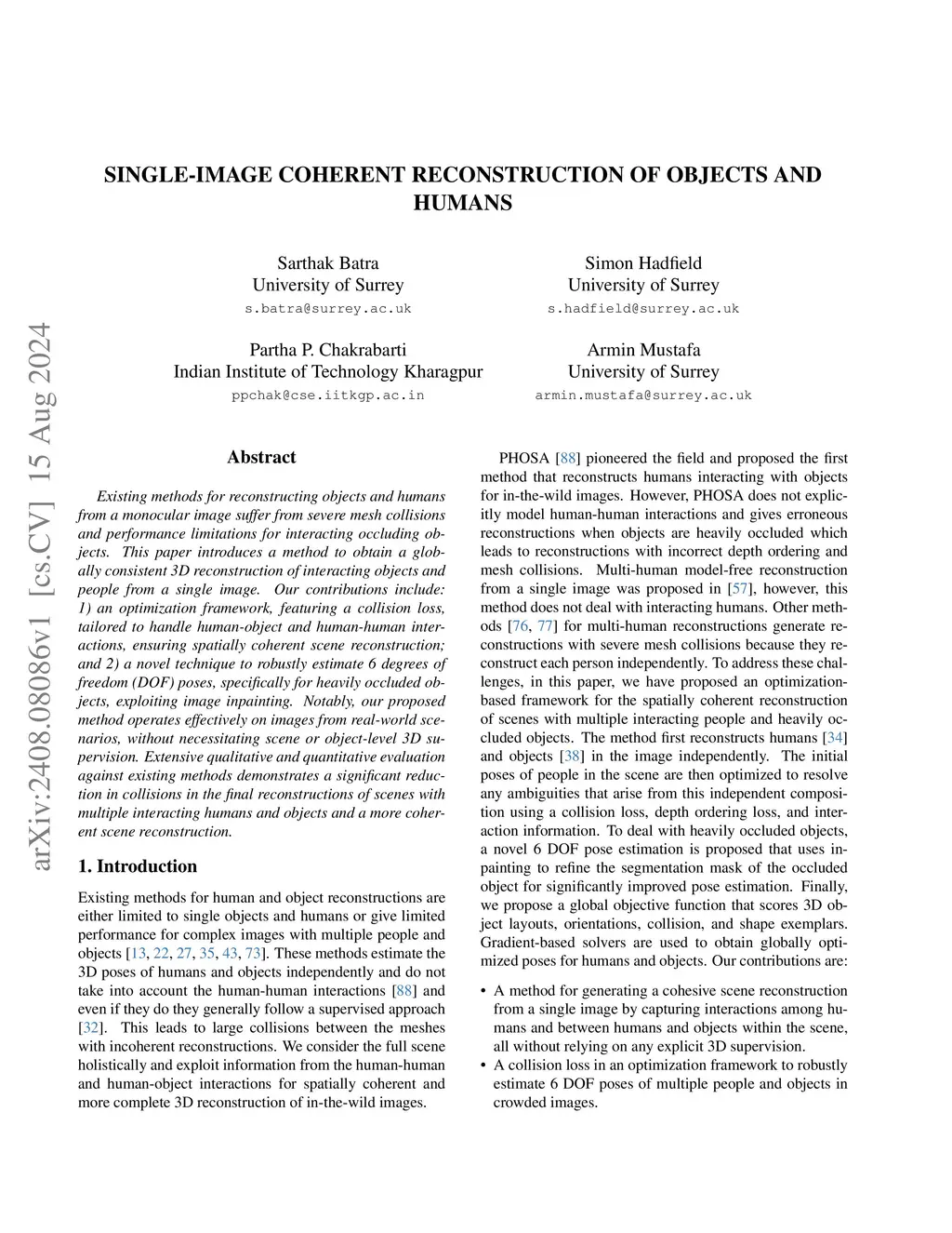 Existing methods for reconstructing objects and humans from a monocular image suffer from severe mesh collisions and performance limitations for interacting occluding objects. This paper introduces a method to obtain a globally consistent 3D reconstruction of interacting objects and people from a single image. Our contributions include: 1) an optimization framework, featuring a collision loss, tailored to handle human-object and human-human interactions, ensuring spatially coherent scene reconstruction; and 2) a novel technique to robustly estimate 6 degrees of freedom (DOF) poses, specifically for heavily occluded objects, exploiting image inpainting. Notably, our proposed method operates effectively on images from real-world scenarios, without necessitating scene or object-level 3D supervision. Extensive qualitative and quantitative evaluation against existing methods demonstrates a significant reduction in collisions in the final reconstructions of scenes with multiple interacting humans and objects and a more coherent scene reconstruction.