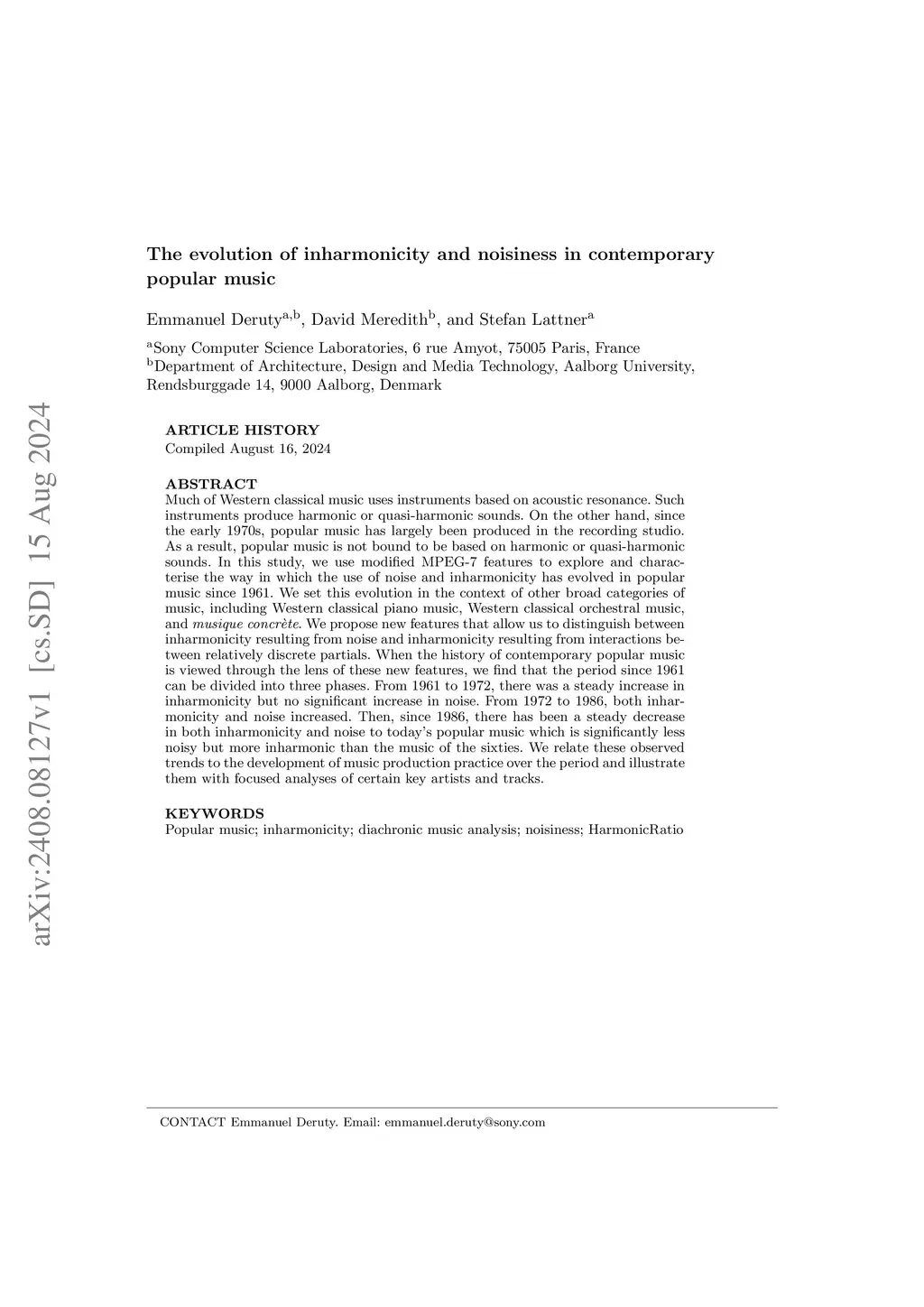 Much of Western classical music uses instruments based on acoustic resonance. Such instruments produce harmonic or quasi-harmonic sounds. On the other hand, since the early 1970s, popular music has largely been produced in the recording studio. As a result, popular music is not bound to be based on harmonic or quasi-harmonic sounds. In this study, we use modified MPEG-7 features to explore and characterise the way in which the use of noise and inharmonicity has evolved in popular music since 1961. We set this evolution in the context of other broad categories of music, including Western classical piano music, Western classical orchestral music, and musique concr\`ete. We propose new features that allow us to distinguish between inharmonicity resulting from noise and inharmonicity resulting from interactions between relatively discrete partials. When the history of contemporary popular music is viewed through the lens of these new features, we find that the period since 1961 can be divided into three phases. From 1961 to 1972, there was a steady increase in inharmonicity but no significant increase in noise. From 1972 to 1986, both inharmonicity and noise increased. Then, since 1986, there has been a steady decrease in both inharmonicity and noise to today's popular music which is significantly less noisy but more inharmonic than the music of the sixties. We relate these observed trends to the development of music production practice over the period and illustrate them with focused analyses of certain key artists and tracks.