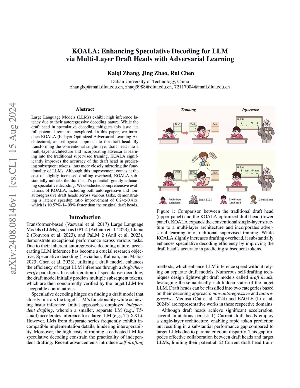 Large Language Models (LLMs) exhibit high inference latency due to their autoregressive decoding nature. While the draft head in speculative decoding mitigates this issue, its full potential remains unexplored. In this paper, we introduce KOALA (K-layer Optimized Adversarial Learning Architecture), an orthogonal approach to the draft head. By transforming the conventional single-layer draft head into a multi-layer architecture and incorporating adversarial learning into the traditional supervised training, KOALA significantly improves the accuracy of the draft head in predicting subsequent tokens, thus more closely mirroring the functionality of LLMs. Although this improvement comes at the cost of slightly increased drafting overhead, KOALA substantially unlocks the draft head's potential, greatly enhancing speculative decoding. We conducted comprehensive evaluations of KOALA, including both autoregressive and non-autoregressive draft heads across various tasks, demonstrating a latency speedup ratio improvement of 0.24x-0.41x, which is 10.57%-14.09% faster than the original draft heads.