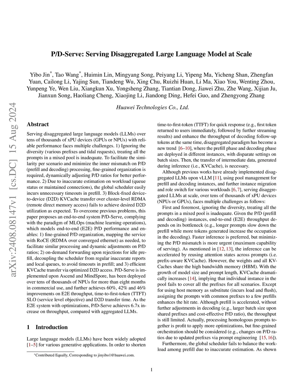 Serving disaggregated large language models (LLMs) over tens of thousands of xPU devices (GPUs or NPUs) with reliable performance faces multiple challenges. 1) Ignoring the diversity (various prefixes and tidal requests), treating all the prompts in a mixed pool is inadequate. To facilitate the similarity per scenario and minimize the inner mismatch on P/D (prefill and decoding) processing, fine-grained organization is required, dynamically adjusting P/D ratios for better performance. 2) Due to inaccurate estimation on workload (queue status or maintained connections), the global scheduler easily incurs unnecessary timeouts in prefill. 3) Block-fixed device-to-device (D2D) KVCache transfer over cluster-level RDMA (remote direct memory access) fails to achieve desired D2D utilization as expected. To overcome previous problems, this paper proposes an end-to-end system P/D-Serve, complying with the paradigm of MLOps (machine learning operations), which models end-to-end (E2E) P/D performance and enables: 1) fine-grained P/D organization, mapping the service with RoCE (RDMA over converged ethernet) as needed, to facilitate similar processing and dynamic adjustments on P/D ratios; 2) on-demand forwarding upon rejections for idle prefill, decoupling the scheduler from regular inaccurate reports and local queues, to avoid timeouts in prefill; and 3) efficient KVCache transfer via optimized D2D access. P/D-Serve is implemented upon Ascend and MindSpore, has been deployed over tens of thousands of NPUs for more than eight months in commercial use, and further achieves 60\%, 42\% and 46\% improvements on E2E throughput, time-to-first-token (TTFT) SLO (service level objective) and D2D transfer time. As the E2E system with optimizations, P/D-Serve achieves 6.7x increase on throughput, compared with aggregated LLMs.