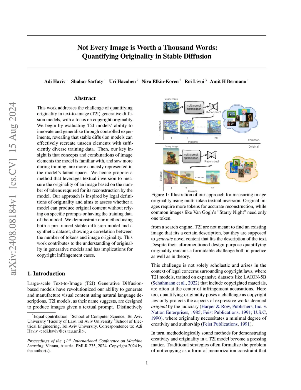 This work addresses the challenge of quantifying originality in text-to-image (T2I) generative diffusion models, with a focus on copyright originality. We begin by evaluating T2I models' ability to innovate and generalize through controlled experiments, revealing that stable diffusion models can effectively recreate unseen elements with sufficiently diverse training data. Then, our key insight is that concepts and combinations of image elements the model is familiar with, and saw more during training, are more concisly represented in the model's latent space. We hence propose a method that leverages textual inversion to measure the originality of an image based on the number of tokens required for its reconstruction by the model. Our approach is inspired by legal definitions of originality and aims to assess whether a model can produce original content without relying on specific prompts or having the training data of the model. We demonstrate our method using both a pre-trained stable diffusion model and a synthetic dataset, showing a correlation between the number of tokens and image originality. This work contributes to the understanding of originality in generative models and has implications for copyright infringement cases.