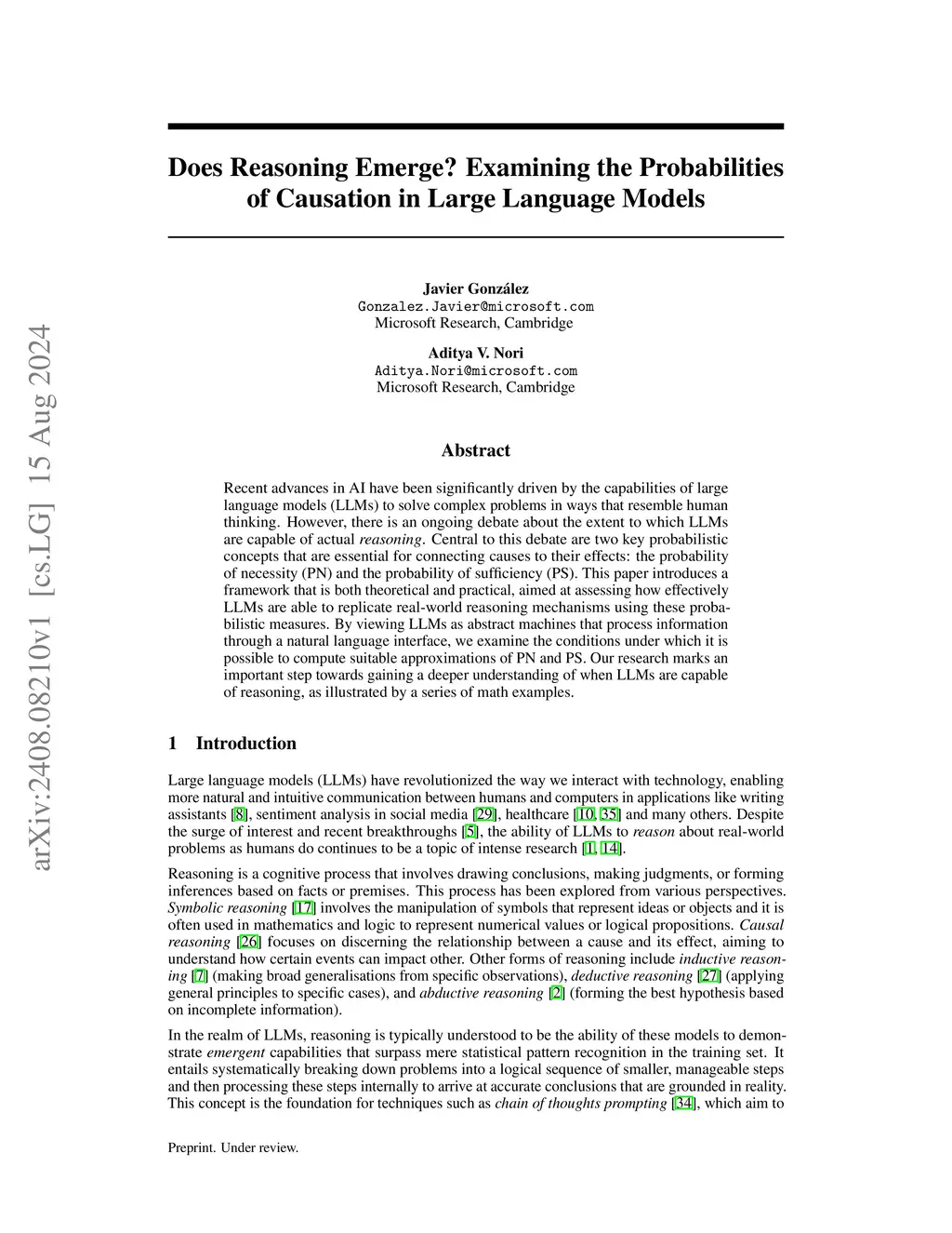 Recent advances in AI have been significantly driven by the capabilities of large language models (LLMs) to solve complex problems in ways that resemble human thinking. However, there is an ongoing debate about the extent to which LLMs are capable of actual reasoning. Central to this debate are two key probabilistic concepts that are essential for connecting causes to their effects: the probability of necessity (PN) and the probability of sufficiency (PS). This paper introduces a framework that is both theoretical and practical, aimed at assessing how effectively LLMs are able to replicate real-world reasoning mechanisms using these probabilistic measures. By viewing LLMs as abstract machines that process information through a natural language interface, we examine the conditions under which it is possible to compute suitable approximations of PN and PS. Our research marks an important step towards gaining a deeper understanding of when LLMs are capable of reasoning, as illustrated by a series of math examples.