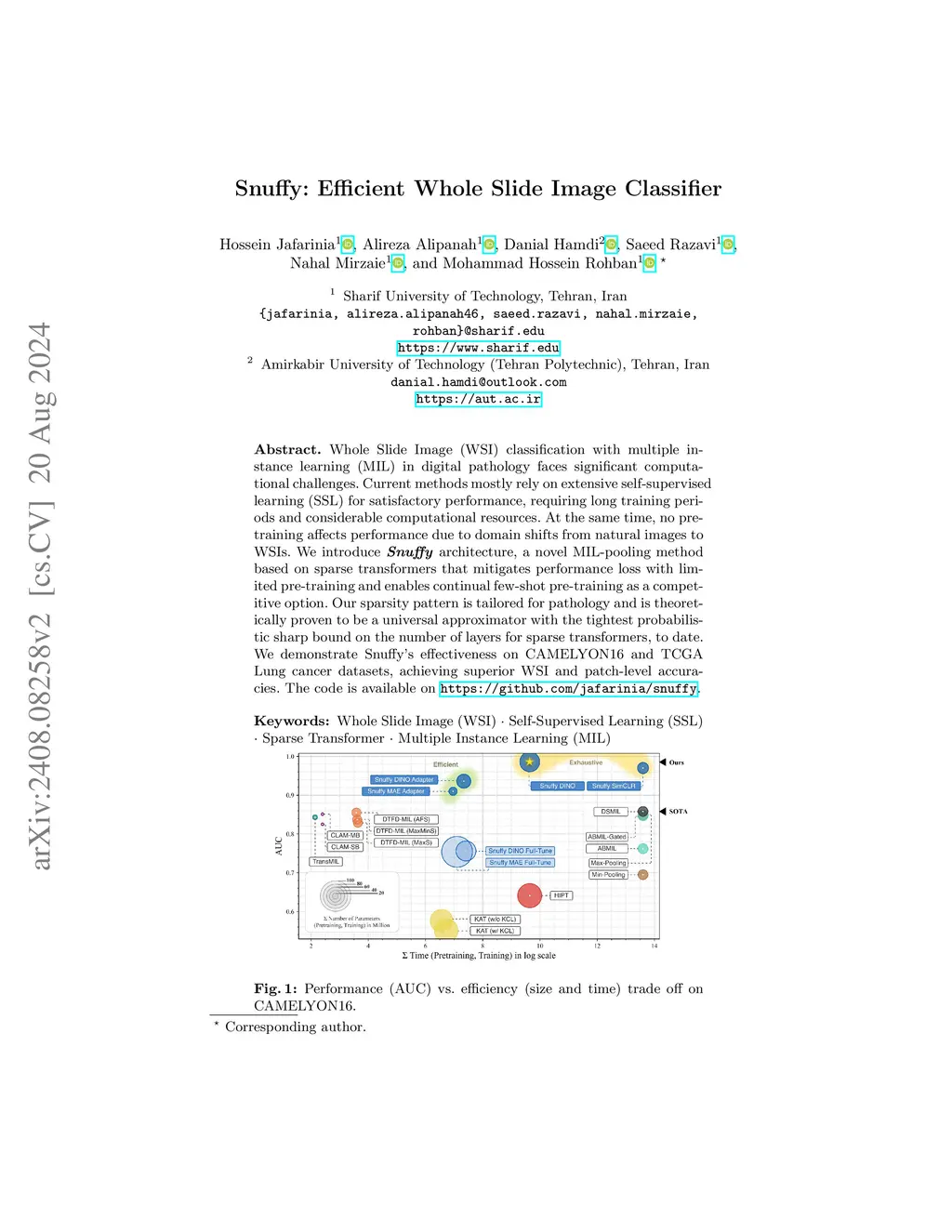 Whole Slide Image (WSI) classification with multiple instance learning (MIL) in digital pathology faces significant computational challenges. Current methods mostly rely on extensive self-supervised learning (SSL) for satisfactory performance, requiring long training periods and considerable computational resources. At the same time, no pre-training affects performance due to domain shifts from natural images to WSIs. We introduce Snuffy architecture, a novel MIL-pooling method based on sparse transformers that mitigates performance loss with limited pre-training and enables continual few-shot pre-training as a competitive option. Our sparsity pattern is tailored for pathology and is theoretically proven to be a universal approximator with the tightest probabilistic sharp bound on the number of layers for sparse transformers, to date. We demonstrate Snuffy's effectiveness on CAMELYON16 and TCGA Lung cancer datasets, achieving superior WSI and patch-level accuracies. The code is available onthis https URL.