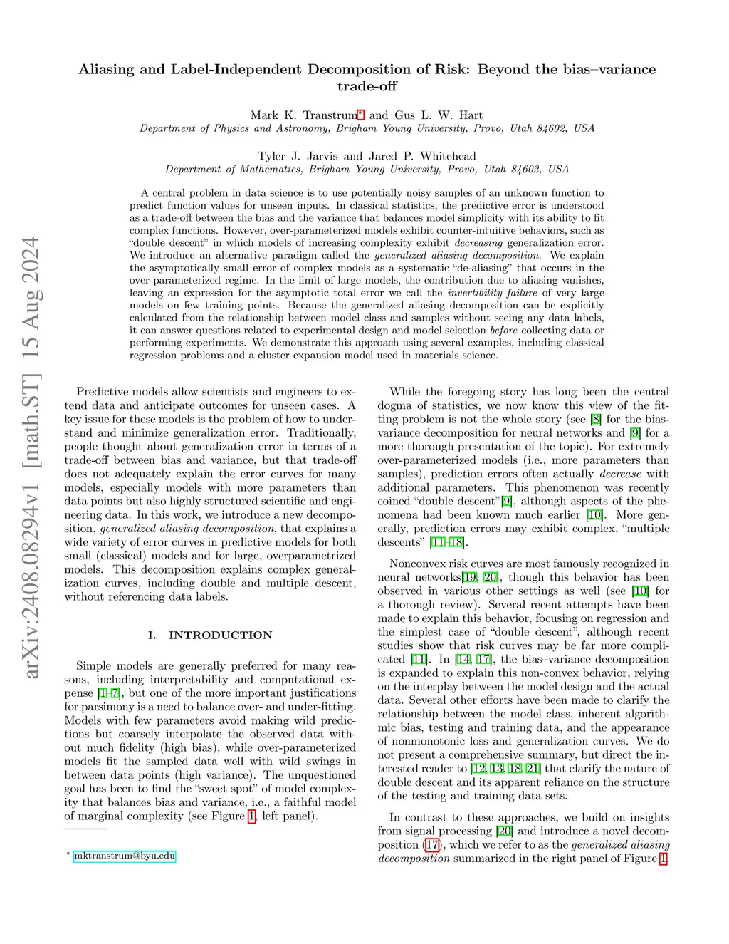 A central problem in data science is to use potentially noisy samples of an unknown function to predict values for unseen inputs. In classical statistics, predictive error is understood as a trade-off between the bias and the variance that balances model simplicity with its ability to fit complex functions. However, over-parameterized models exhibit counterintuitive behaviors, such as "double descent" in which models of increasing complexity exhibit decreasing generalization error. Others may exhibit more complicated patterns of predictive error with multiple peaks and valleys. Neither double descent nor multiple descent phenomena are well explained by the bias-variance decomposition.We introduce a novel decomposition that we call the generalized aliasing decomposition (GAD) to explain the relationship between predictive performance and model complexity. The GAD decomposes the predictive error into three parts: 1) model insufficiency, which dominates when the number of parameters is much smaller than the number of data points, 2) data insufficiency, which dominates when the number of parameters is much greater than the number of data points, and 3) generalized aliasing, which dominates between these two extremes.We demonstrate the applicability of the GAD to diverse applications, including random feature models from machine learning, Fourier transforms from signal processing, solution methods for differential equations, and predictive formation enthalpy in materials discovery. Because key components of the GAD can be explicitly calculated from the relationship between model class and samples without seeing any data labels, it can answer questions related to experimental design and model selection before collecting data or performing experiments. We further demonstrate this approach on several examples and discuss implications for predictive modeling and data science.