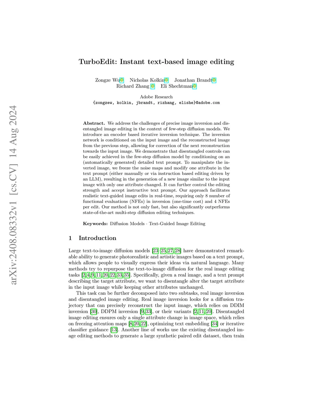 We address the challenges of precise image inversion and disentangled image editing in the context of few-step diffusion models. We introduce an encoder based iterative inversion technique. The inversion network is conditioned on the input image and the reconstructed image from the previous step, allowing for correction of the next reconstruction towards the input image. We demonstrate that disentangled controls can be easily achieved in the few-step diffusion model by conditioning on an (automatically generated) detailed text prompt. To manipulate the inverted image, we freeze the noise maps and modify one attribute in the text prompt (either manually or via instruction based editing driven by an LLM), resulting in the generation of a new image similar to the input image with only one attribute changed. It can further control the editing strength and accept instructive text prompt. Our approach facilitates realistic text-guided image edits in real-time, requiring only 8 number of functional evaluations (NFEs) in inversion (one-time cost) and 4 NFEs per edit. Our method is not only fast, but also significantly outperforms state-of-the-art multi-step diffusion editing techniques.