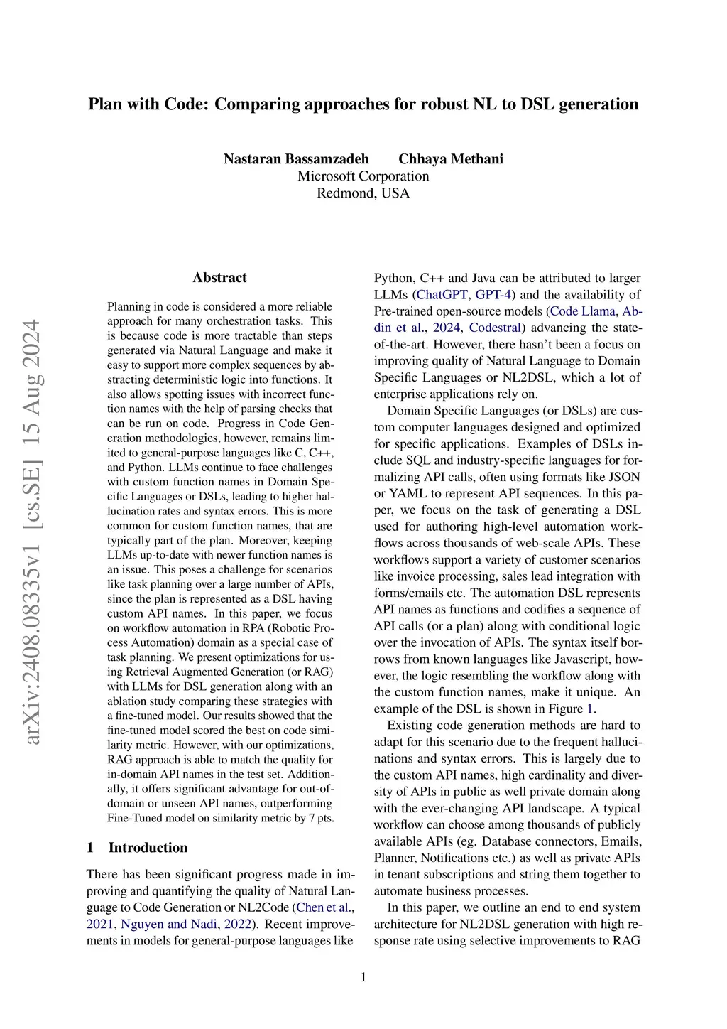 Planning in code is considered a more reliable approach for many orchestration tasks. This is because code is more tractable than steps generated via Natural Language and make it easy to support more complex sequences by abstracting deterministic logic into functions. It also allows spotting issues with incorrect function names with the help of parsing checks that can be run on code. Progress in Code Generation methodologies, however, remains limited to general-purpose languages like C, C++, and Python. LLMs continue to face challenges with custom function names in Domain Specific Languages or DSLs, leading to higher hallucination rates and syntax errors. This is more common for custom function names, that are typically part of the plan. Moreover, keeping LLMs up-to-date with newer function names is an issue. This poses a challenge for scenarios like task planning over a large number of APIs, since the plan is represented as a DSL having custom API names. In this paper, we focus on workflow automation in RPA (Robotic Process Automation) domain as a special case of task planning. We present optimizations for using Retrieval Augmented Generation (or RAG) with LLMs for DSL generation along with an ablation study comparing these strategies with a fine-tuned model. Our results showed that the fine-tuned model scored the best on code similarity metric. However, with our optimizations, RAG approach is able to match the quality for in-domain API names in the test set. Additionally, it offers significant advantage for out-of-domain or unseen API names, outperforming Fine-Tuned model on similarity metric by 7 pts.