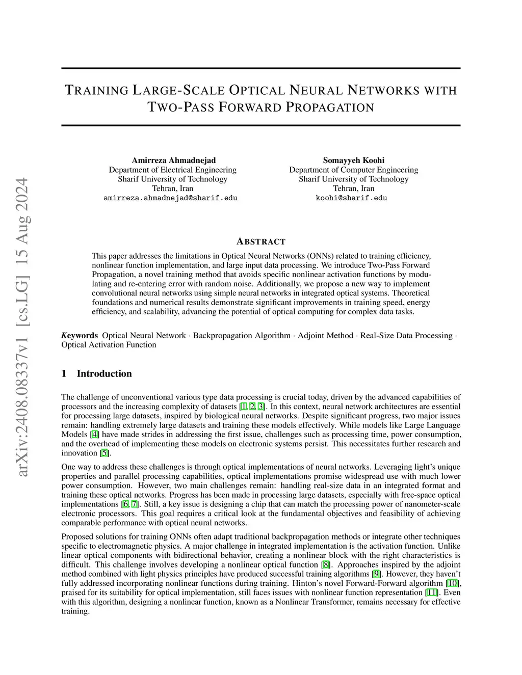 This paper addresses the limitations in Optical Neural Networks (ONNs) related to training efficiency, nonlinear function implementation, and large input data processing. We introduce Two-Pass Forward Propagation, a novel training method that avoids specific nonlinear activation functions by modulating and re-entering error with random noise. Additionally, we propose a new way to implement convolutional neural networks using simple neural networks in integrated optical systems. Theoretical foundations and numerical results demonstrate significant improvements in training speed, energy efficiency, and scalability, advancing the potential of optical computing for complex data tasks.