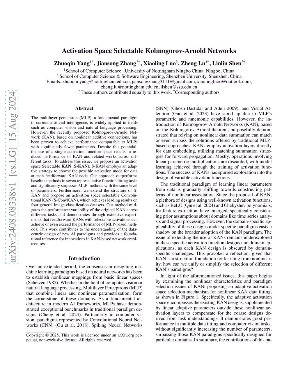 The multilayer perceptron (MLP), a fundamental paradigm in current artificial intelligence, is widely applied in fields such as computer vision and natural language processing. However, the recently proposed Kolmogorov-Arnold Network (KAN), based on nonlinear additive connections, has been proven to achieve performance comparable to MLPs with significantly fewer parameters. Despite this potential, the use of a single activation function space results in reduced performance of KAN and related works across different tasks. To address this issue, we propose an activation space Selectable KAN (S-KAN). S-KAN employs an adaptive strategy to choose the possible activation mode for data at each feedforward KAN node. Our approach outperforms baseline methods in seven representative function fitting tasks and significantly surpasses MLP methods with the same level of parameters. Furthermore, we extend the structure of S-KAN and propose an activation space selectable Convolutional KAN (S-ConvKAN), which achieves leading results on four general image classification datasets. Our method mitigates the performance variability of the original KAN across different tasks and demonstrates through extensive experiments that feedforward KANs with selectable activations can achieve or even exceed the performance of MLP-based methods. This work contributes to the understanding of the data-centric design of new AI paradigms and provides a foundational reference for innovations in KAN-based network architectures.