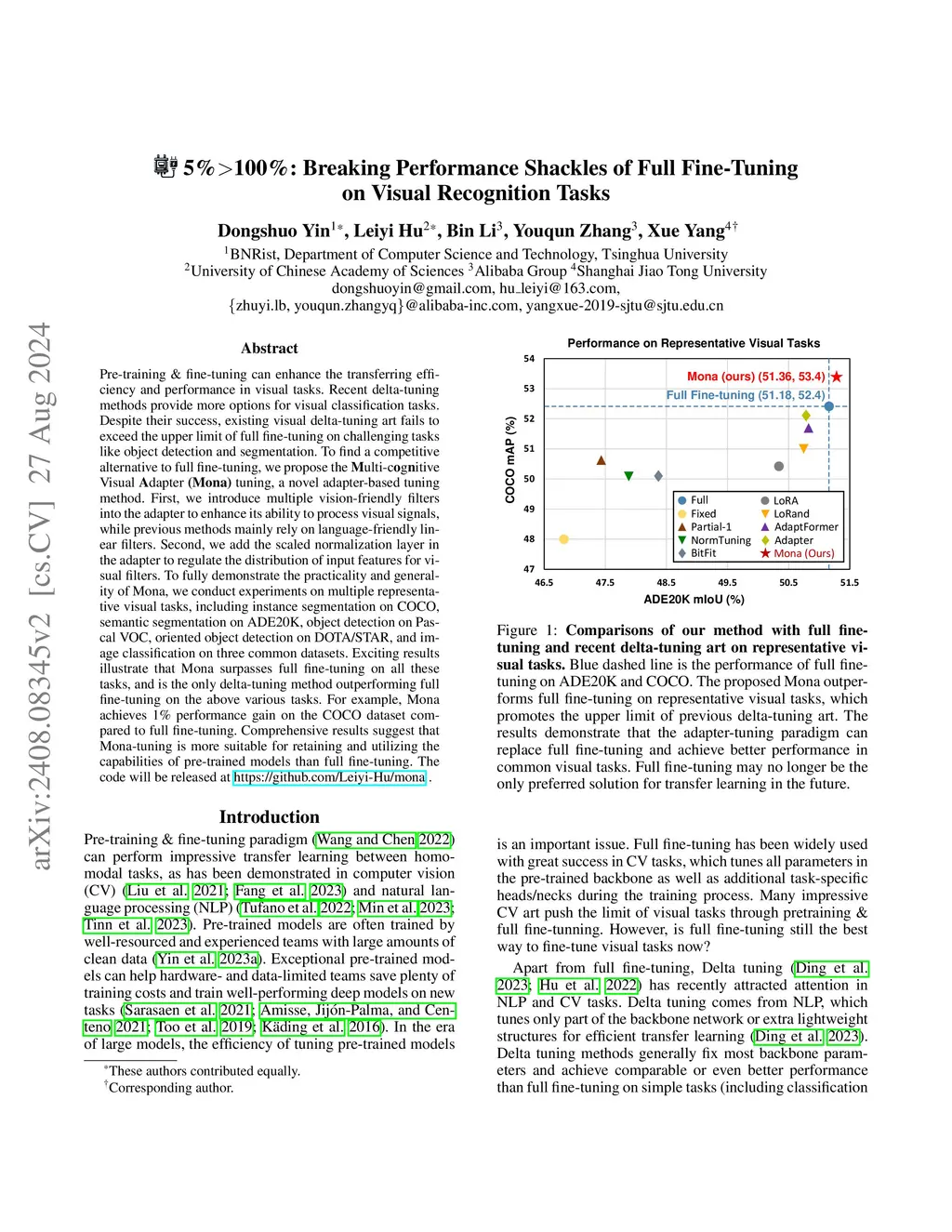 Pre-training & fine-tuning can enhance the transferring efficiency and performance in visual tasks. Recent delta-tuning methods provide more options for visual classification tasks. Despite their success, existing visual delta-tuning art fails to exceed the upper limit of full fine-tuning on challenging tasks like object detection and segmentation. To find a competitive alternative to full fine-tuning, we propose the Multi-cognitive Visual Adapter (Mona) tuning, a novel adapter-based tuning method. First, we introduce multiple vision-friendly filters into the adapter to enhance its ability to process visual signals, while previous methods mainly rely on language-friendly linear filters. Second, we add the scaled normalization layer in the adapter to regulate the distribution of input features for visual filters. To fully demonstrate the practicality and generality of Mona, we conduct experiments on multiple representative visual tasks, including instance segmentation on COCO, semantic segmentation on ADE20K, object detection on Pascal VOC, oriented object detection on DOTA/STAR, and image classification on three common datasets. Exciting results illustrate that Mona surpasses full fine-tuning on all these tasks, and is the only delta-tuning method outperforming full fine-tuning on the above various tasks. For example, Mona achieves 1% performance gain on the COCO dataset compared to full fine-tuning. Comprehensive results suggest that Mona-tuning is more suitable for retaining and utilizing the capabilities of pre-trained models than full fine-tuning. The code will be released at https://github.com/Leiyi-Hu/mona.