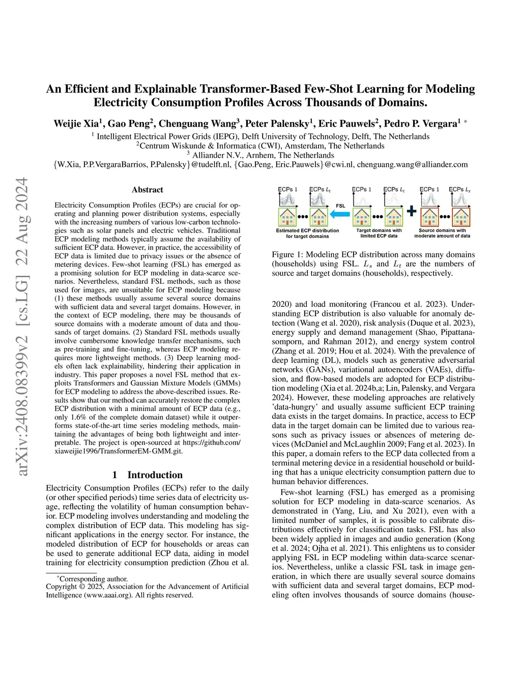 Electricity Consumption Profiles (ECPs) are crucial for operating and planning power distribution systems, especially with the increasing numbers of various low-carbon technologies such as solar panels and electric vehicles. Traditional ECP modeling methods typically assume the availability of sufficient ECP data. However, in practice, the accessibility of ECP data is limited due to privacy issues or the absence of metering devices. Few-shot learning (FSL) has emerged as a promising solution for ECP modeling in data-scarce scenarios. Nevertheless, standard FSL methods, such as those used for images, are unsuitable for ECP modeling because (1) these methods usually assume several source domains with sufficient data and several target domains. However, in the context of ECP modeling, there may be thousands of source domains with a moderate amount of data and thousands of target domains. (2) Standard FSL methods usually involve cumbersome knowledge transfer mechanisms, such as pre-training and fine-tuning, whereas ECP modeling requires more lightweight methods. (3) Deep learning models often lack explainability, hindering their application in industry. This paper proposes a novel FSL method that exploits Transformers and Gaussian Mixture Models (GMMs) for ECP modeling to address the above-described issues. Results show that our method can accurately restore the complex ECP distribution with a minimal amount of ECP data (e.g., only 1.6\% of the complete domain dataset) while it outperforms state-of-the-art time series modeling methods, maintaining the advantages of being both lightweight and interpretable. The project is open-sourced at https://github.com/xiaweijie1996/TransformerEM-GMM.git.