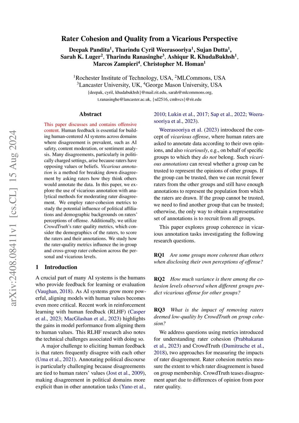 Human feedback is essential for building human-centered AI systems across domains where disagreement is prevalent, such as AI safety, content moderation, or sentiment analysis. Many disagreements, particularly in politically charged settings, arise because raters have opposing values or beliefs. Vicarious annotation is a method for breaking down disagreement by asking raters how they think others would annotate the data. In this paper, we explore the use of vicarious annotation with analytical methods for moderating rater disagreement. We employ rater cohesion metrics to study the potential influence of political affiliations and demographic backgrounds on raters' perceptions of offense. Additionally, we utilize CrowdTruth's rater quality metrics, which consider the demographics of the raters, to score the raters and their annotations. We study how the rater quality metrics influence the in-group and cross-group rater cohesion across the personal and vicarious levels.