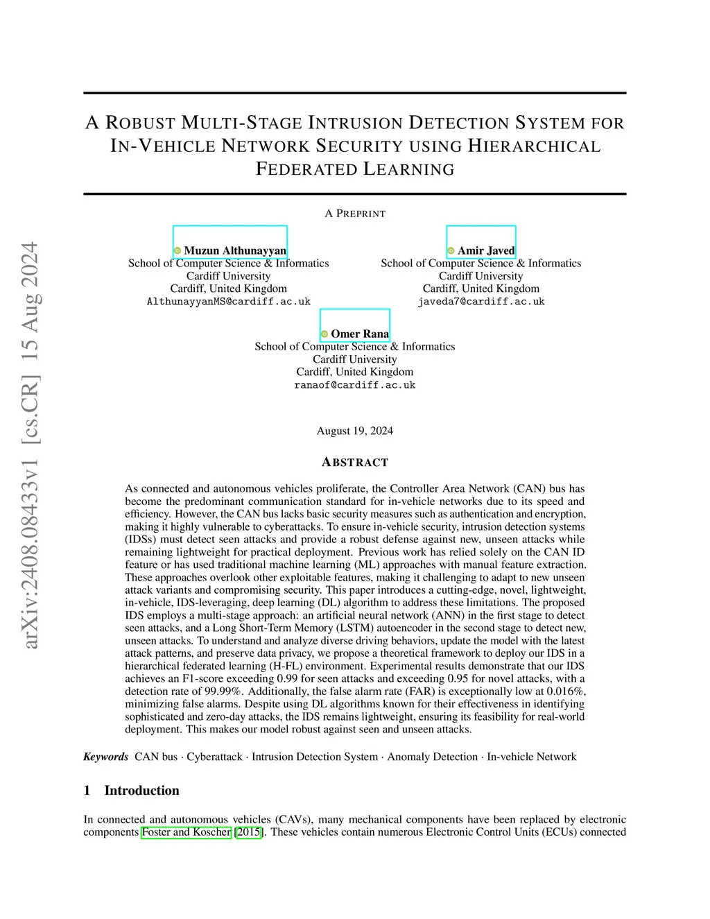 As connected and autonomous vehicles proliferate, the Controller Area Network (CAN) bus has become the predominant communication standard for in-vehicle networks due to its speed and efficiency. However, the CAN bus lacks basic security measures such as authentication and encryption, making it highly vulnerable to cyberattacks. To ensure in-vehicle security, intrusion detection systems (IDSs) must detect seen attacks and provide a robust defense against new, unseen attacks while remaining lightweight for practical deployment. Previous work has relied solely on the CAN ID feature or has used traditional machine learning (ML) approaches with manual feature extraction. These approaches overlook other exploitable features, making it challenging to adapt to new unseen attack variants and compromising security. This paper introduces a cutting-edge, novel, lightweight, in-vehicle, IDS-leveraging, deep learning (DL) algorithm to address these limitations. The proposed IDS employs a multi-stage approach: an artificial neural network (ANN) in the first stage to detect seen attacks, and a Long Short-Term Memory (LSTM) autoencoder in the second stage to detect new, unseen attacks. To understand and analyze diverse driving behaviors, update the model with the latest attack patterns, and preserve data privacy, we propose a theoretical framework to deploy our IDS in a hierarchical federated learning (H-FL) environment. Experimental results demonstrate that our IDS achieves an F1-score exceeding 0.99 for seen attacks and exceeding 0.95 for novel attacks, with a detection rate of 99.99%. Additionally, the false alarm rate (FAR) is exceptionally low at 0.016%, minimizing false alarms. Despite using DL algorithms known for their effectiveness in identifying sophisticated and zero-day attacks, the IDS remains lightweight, ensuring its feasibility for real-world deployment.