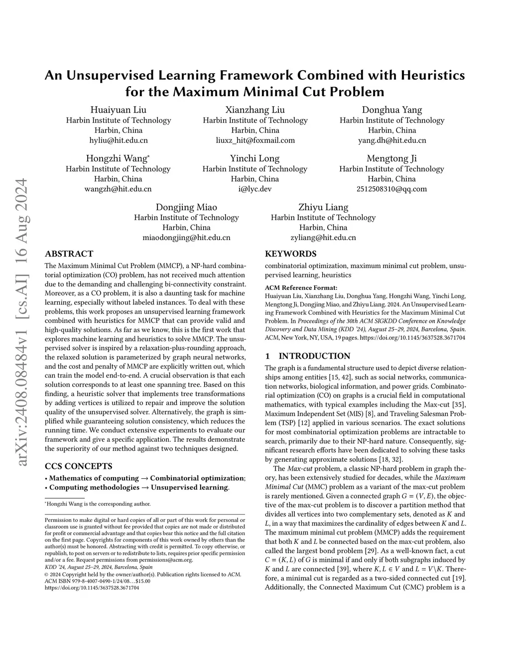 The Maximum Minimal Cut Problem (MMCP), a NP-hard combinatorial optimization (CO) problem, has not received much attention due to the demanding and challenging bi-connectivity constraint. Moreover, as a CO problem, it is also a daunting task for machine learning, especially without labeled instances. To deal with these problems, this work proposes an unsupervised learning framework combined with heuristics for MMCP that can provide valid and high-quality solutions. As far as we know, this is the first work that explores machine learning and heuristics to solve MMCP. The unsupervised solver is inspired by a relaxation-plus-rounding approach, the relaxed solution is parameterized by graph neural networks, and the cost and penalty of MMCP are explicitly written out, which can train the model end-to-end. A crucial observation is that each solution corresponds to at least one spanning tree. Based on this finding, a heuristic solver that implements tree transformations by adding vertices is utilized to repair and improve the solution quality of the unsupervised solver. Alternatively, the graph is simplified while guaranteeing solution consistency, which reduces the running time. We conduct extensive experiments to evaluate our framework and give a specific application. The results demonstrate the superiority of our method against two techniques designed.