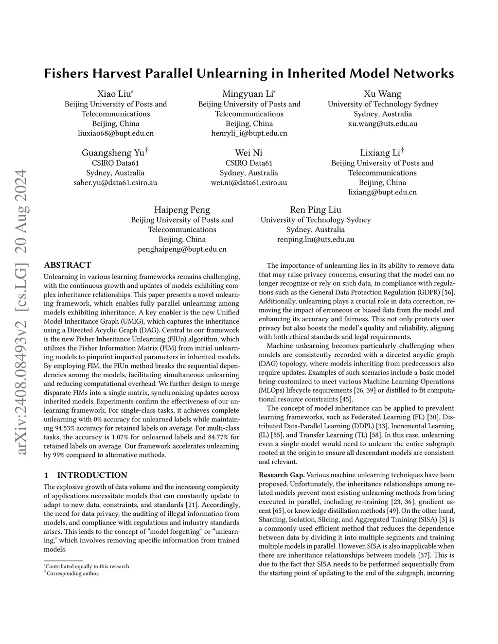 Unlearning is challenging in generic learning frameworks with the continuous growth and updates of models exhibiting complex inheritance relationships. This paper presents a novel unlearning framework that enables fully parallel unlearning among models exhibiting inheritance. We use a chronologically Directed Acyclic Graph (DAG) to capture various unlearning scenarios occurring in model inheritance networks. Central to our framework is the Fisher Inheritance Unlearning (FIUn) method, designed to enable efficient parallel unlearning within the DAG. FIUn utilizes the Fisher Information Matrix (FIM) to assess the significance of model parameters for unlearning tasks and adjusts them accordingly. To handle multiple unlearning requests simultaneously, we propose the Merging-FIM (MFIM) function, which consolidates FIMs from multiple upstream models into a unified matrix. This design supports all unlearning scenarios captured by the DAG, enabling one-shot removal of inherited knowledge while significantly reducing computational overhead. Experiments confirm the effectiveness of our unlearning framework. For single-class tasks, it achieves complete unlearning with 0% accuracy for unlearned labels while maintaining 94.53% accuracy for retained labels. For multi-class tasks, the accuracy is 1.07% for unlearned labels and 84.77% for retained labels. Our framework accelerates unlearning by 99% compared to alternative methods. Code is inthis https URL.